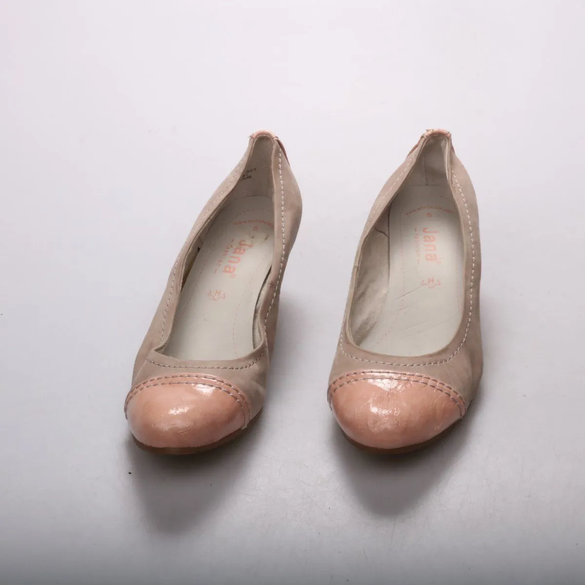 Женские туфли Jana на устойчивом невысоком каблуке, с контрастным розовым носком. Подойдут для офиса и повседневной носки в тёплое время года и в помещении. Рифлёная подошва снижает скольжение.