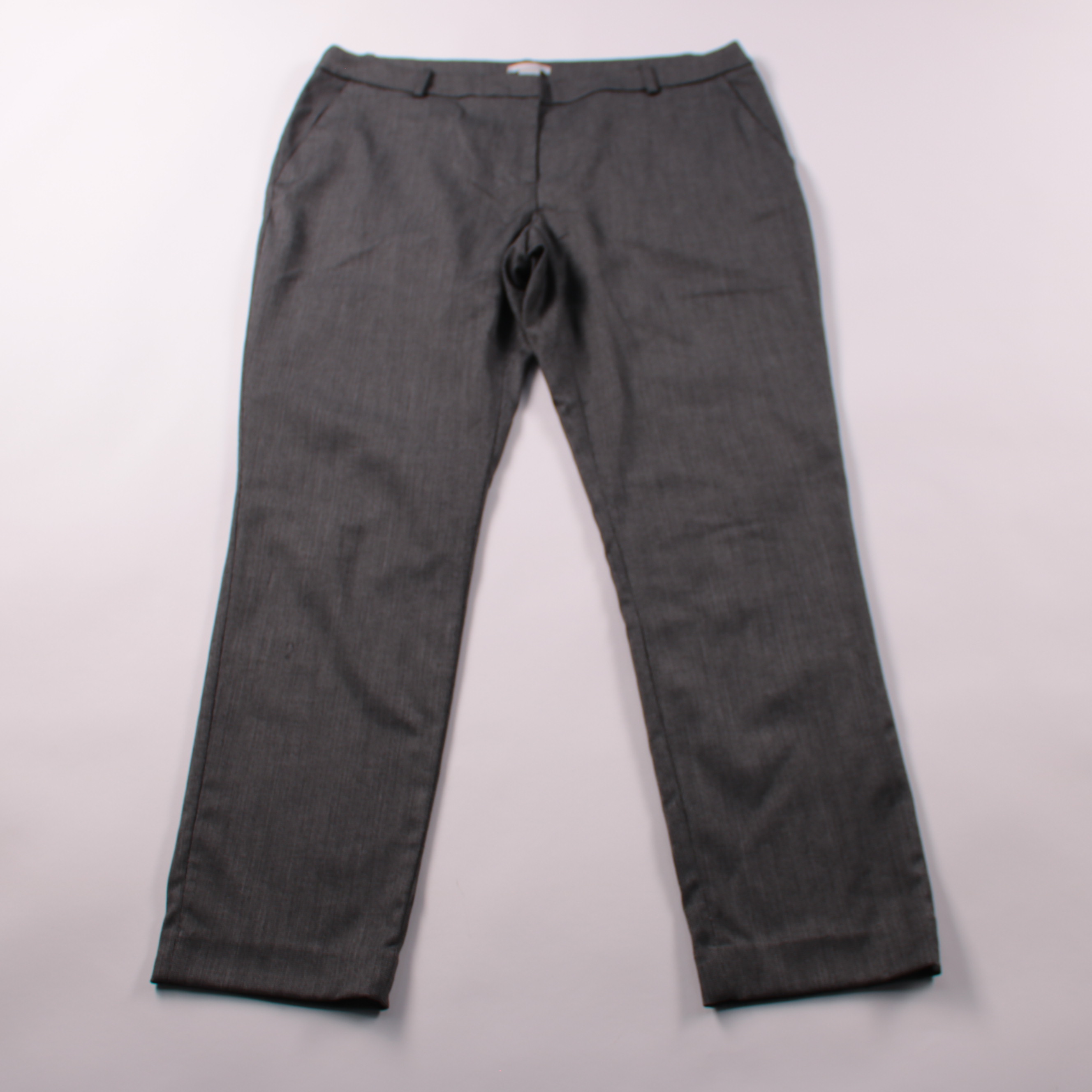 Женские классические брюки H&M прямого кроя в тёмно-сером цвете. Подойдут для офиса и повседневных образов с рубашкой или свитером. Материал с добавлением эластана даёт комфортную посадку и меньше мнётся.