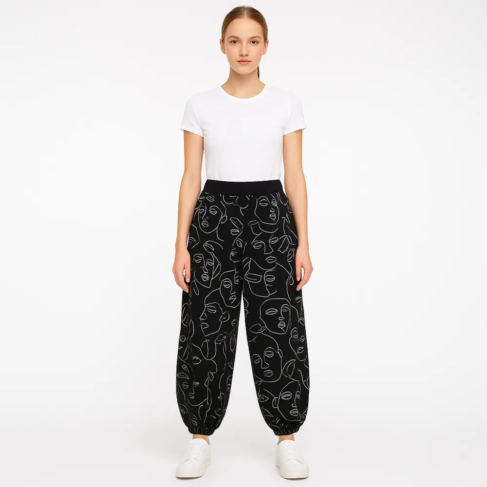 Женские брюки из 100% вискозы с принтом в виде контурных лиц и эластичным поясом. Подойдут для повседневных образов и поездок, когда хочется комфортной посадки и свободного кроя. Лёгкая ткань хорошо драпируется и приятна к телу.