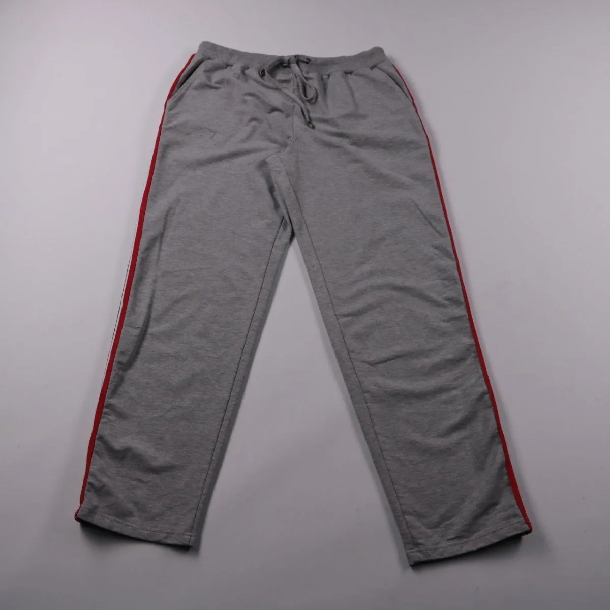 Спортивные брюки из мягкого трикотажа серого цвета с красными лампасами по бокам и поясом на шнурке. Подойдут для дома, прогулок и тренировок в прохладную погоду. Удобная посадка и эластичный пояс обеспечивают комфорт и свободу движений.