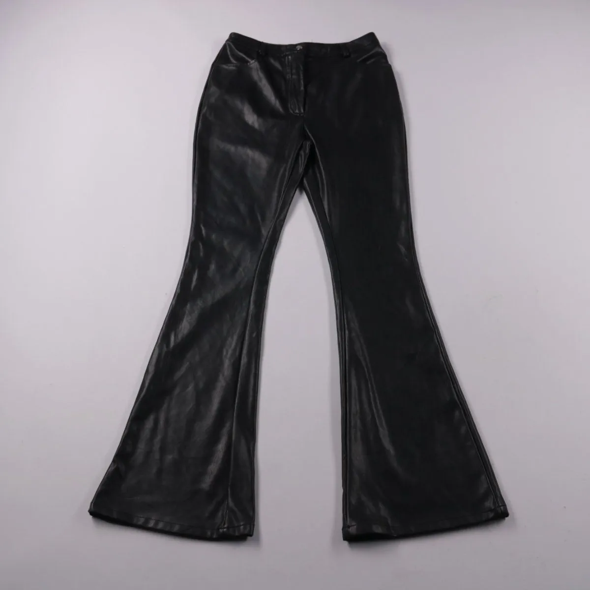 Женские брюки boohoo by Kourtney Kardashian из экокожи чёрного цвета с расклешением к низу. Подойдут для повседневных образов и вечерних выходов с ботильонами или каблуком. Практичны в уходе — поверхность можно протирать влажной тканью.