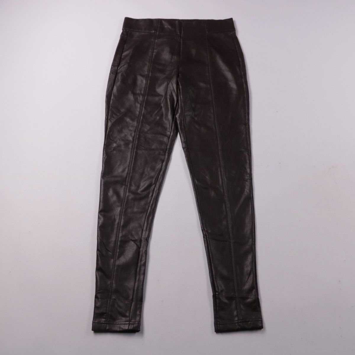 Женские брюки M&S из ткани с полиуретановым покрытием под кожу, зауженного силуэта. Подойдут для повседневных образов в прохладную погоду и на выход. Материал слегка тянется и легко очищается влажной салфеткой.