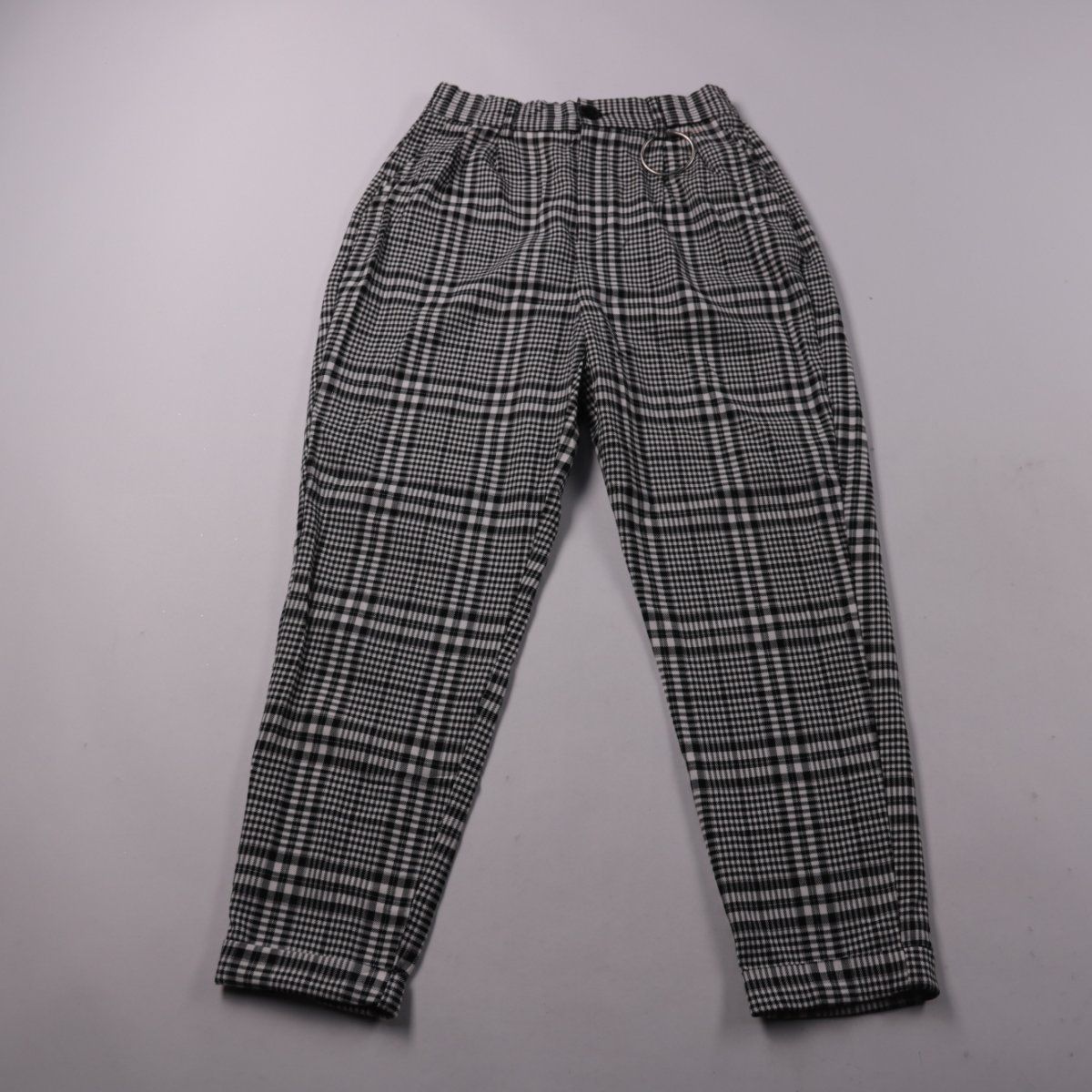 Женские брюки Bershka в чёрно-белую клетку, с эластичным поясом и декоративным ремнём с кольцом. Подойдут для повседневных образов и офиса в стиле casual. Практичный плюс — ткань с добавлением эластана, поэтому посадка комфортная и не сковывает движения.