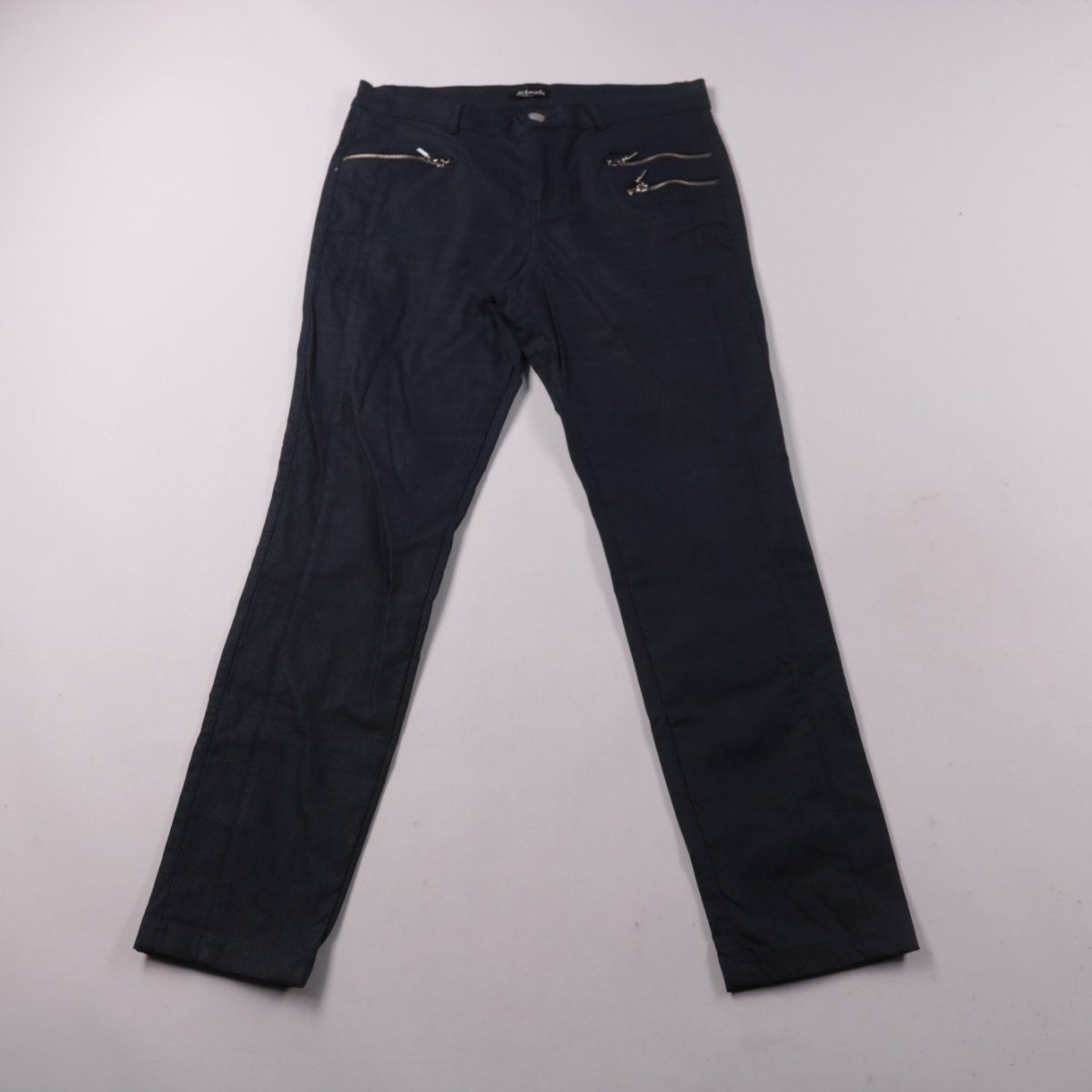 Женские брюки зауженного кроя, без указанного бренда, чёрного цвета. Модель с карманами на молниях, подойдёт для повседневных образов и офиса в стиле casual. Практичный плюс — тёмная ткань немаркая и легко сочетается с базовым гардеробом.
