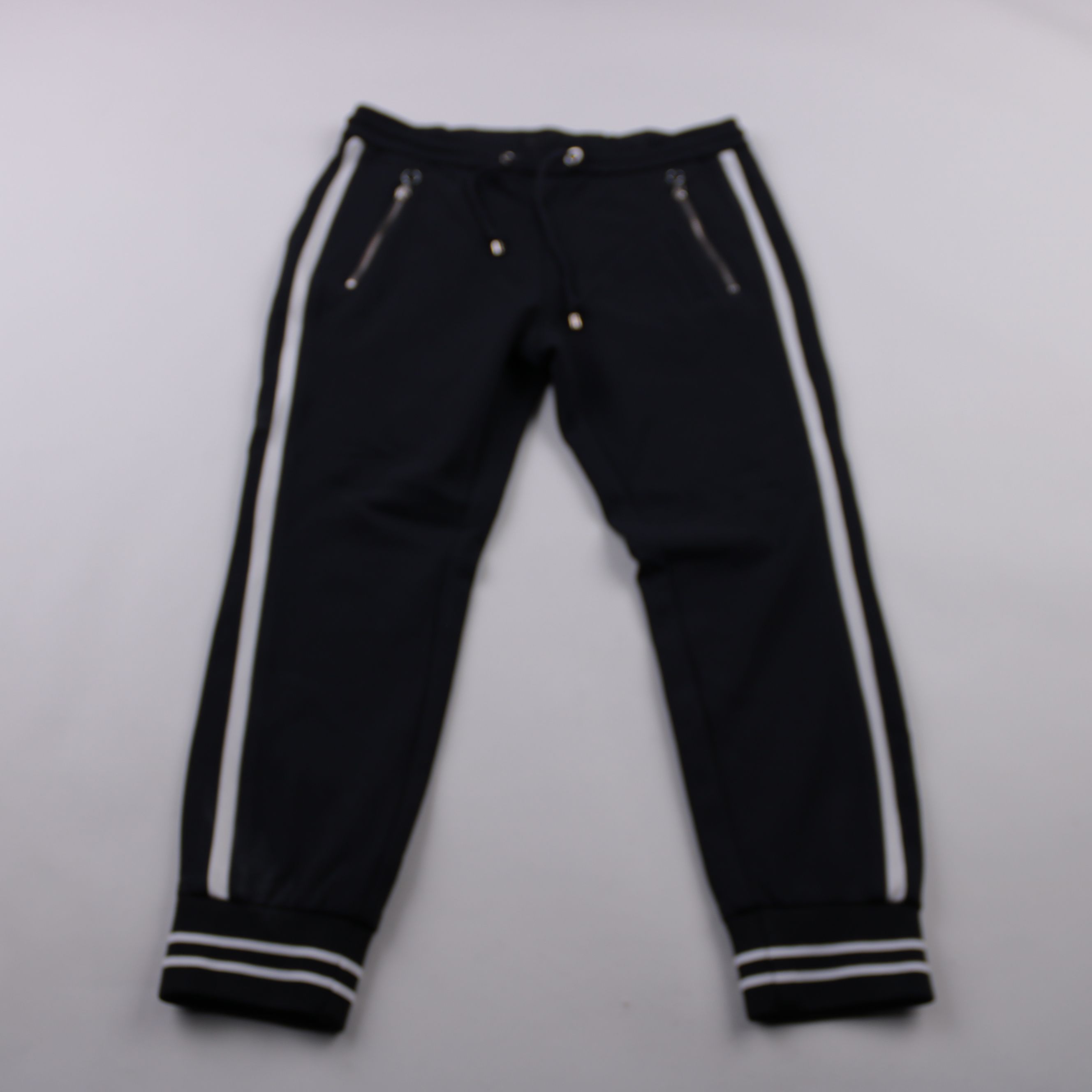 Брюки A в спортивном стиле, чёрные с белыми лампасами и молниями на карманах. Подойдут для повседневной носки и прогулок в прохладную погоду. Практичное преимущество — удобная посадка и функциональные карманы на молнии.