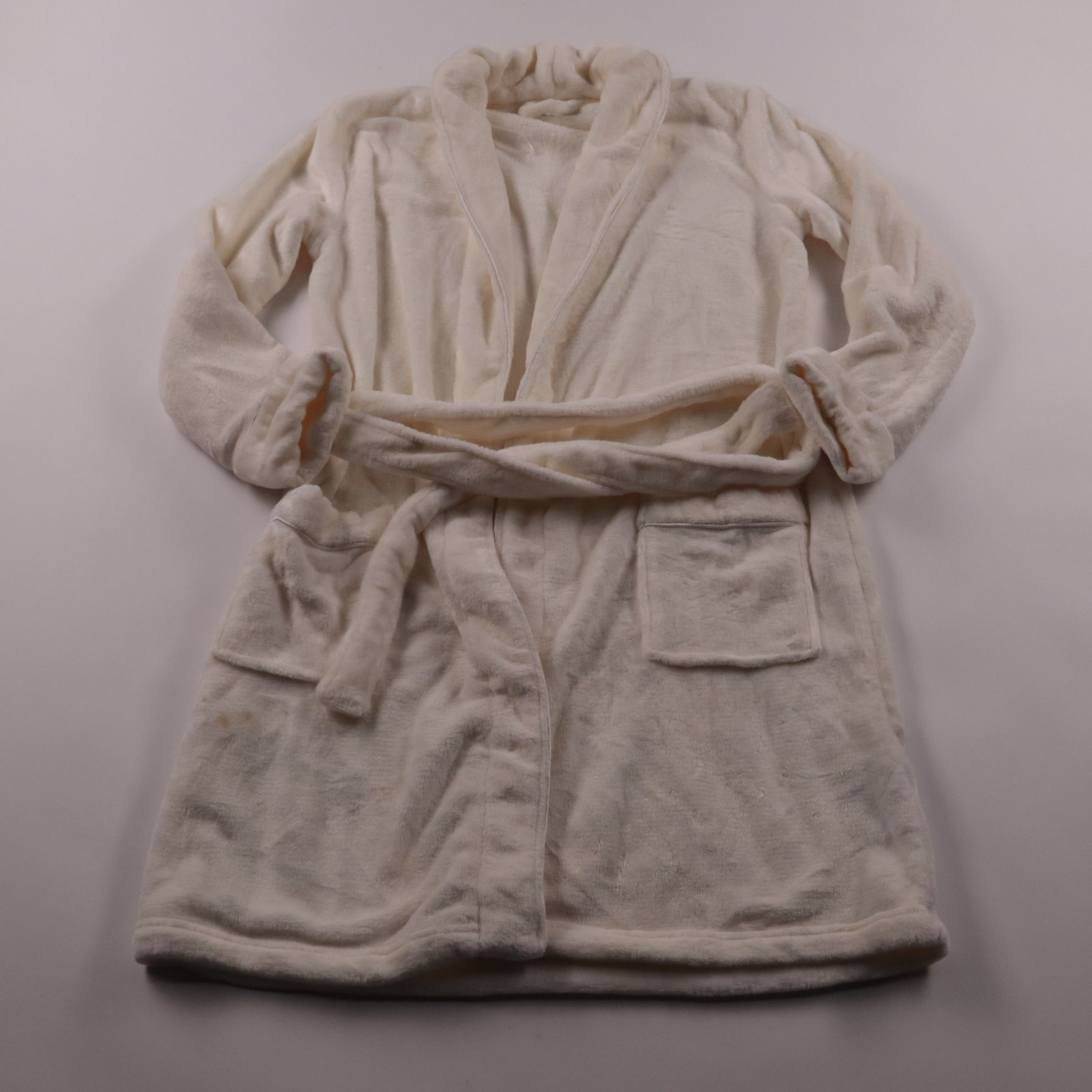 Мягкий домашний халат Tex молочного цвета с поясом и накладными карманами. Подойдёт для дома, бани или после душа, ткань приятная к телу и хорошо сохраняет тепло. Практичен в уходе: полиэстер быстро сохнет и не сильно мнётся.