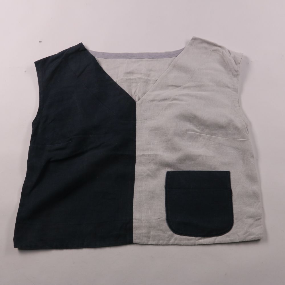 Двухцветный жилет без рукавов с V-образным вырезом и накладным карманом спереди. Подойдёт для повседневных образов и как слой поверх рубашки или лонгслива в прохладную погоду. Ткань лёгкая и комфортная, не сковывает движения.