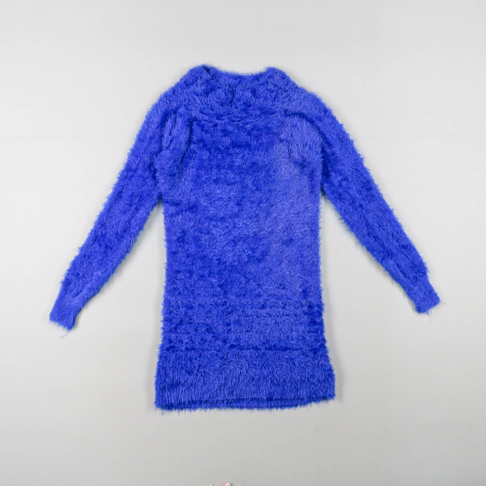 Пушистый женский свитер ярко-синего цвета с длинным рукавом и мягкой фактурой. Подойдёт для холодной погоды и уютных повседневных образов с джинсами или юбкой. Тёплый и приятный к телу, хорошо сохраняет тепло.