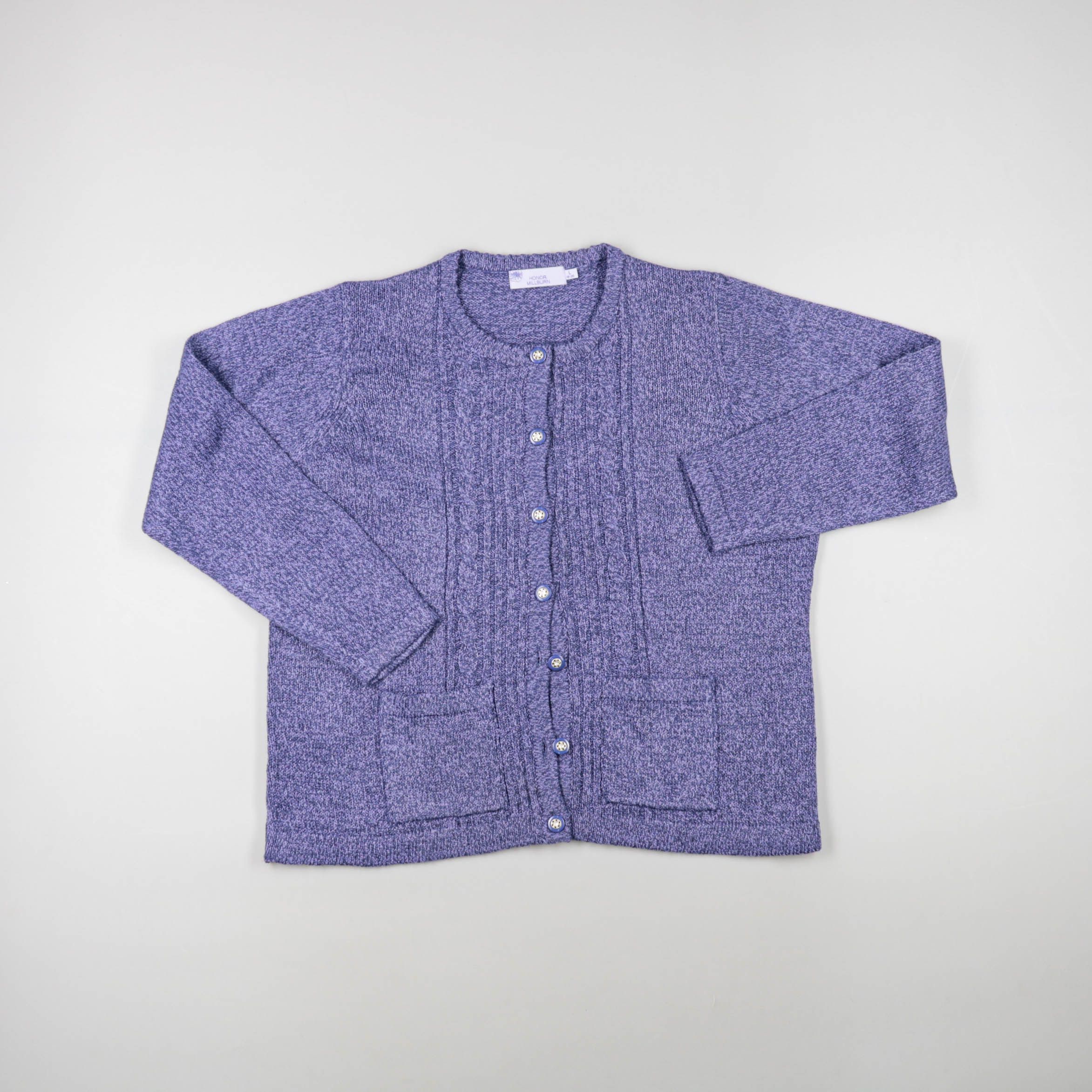 Вязаный кардиган Sonja Marohn в меланжевом фиолетовом цвете, на пуговицах и с накладными карманами. Подойдёт для офиса и на каждый день — легко сочетается с джинсами, юбкой или платьем. Практичный плюс: удобная застёжка и карманы для мелочей.