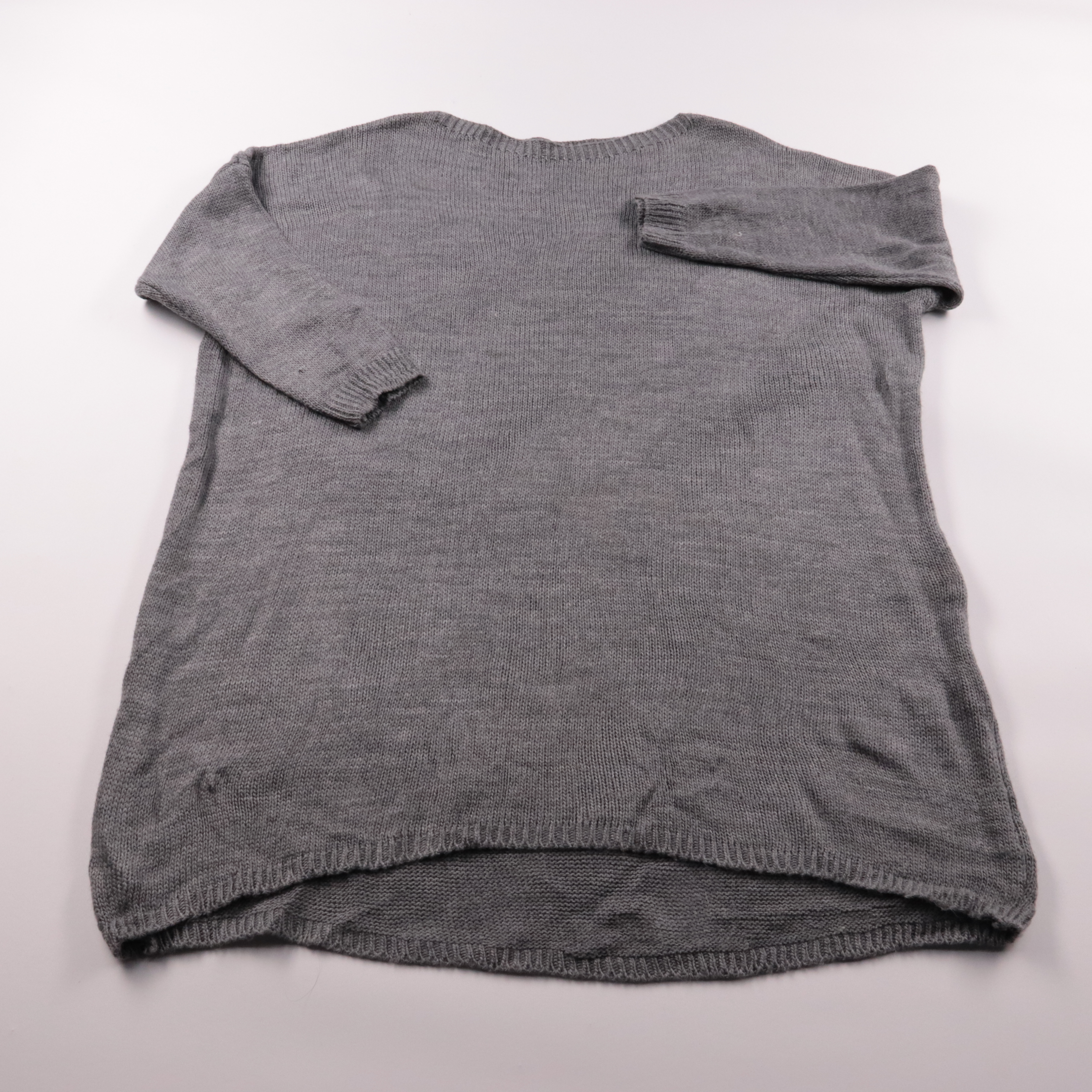 Серый вязаный джемпер свободного кроя с округлым вырезом и удлинённой спинкой. Подойдёт для повседневных образов в прохладную погоду, легко сочетается с джинсами и юбками. Акриловый состав практичен в уходе и быстро сохнет.