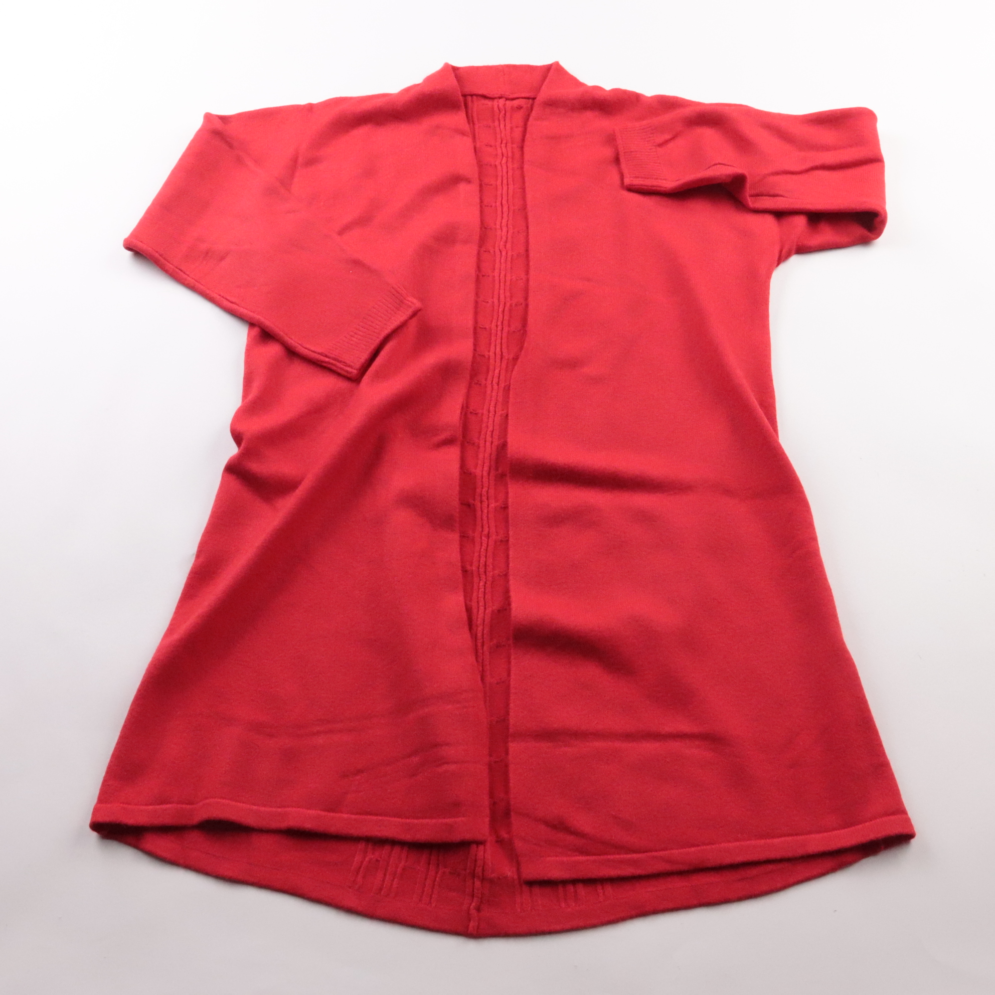 Красный удлинённый кардиган без застёжки, мягкий и приятный к телу. Подойдёт для офиса и повседневных образов в прохладную погоду, удобно носить как накиду поверх топа или платья. Практичный вариант: легко сочетается с базовыми вещами и не сковывает дв...