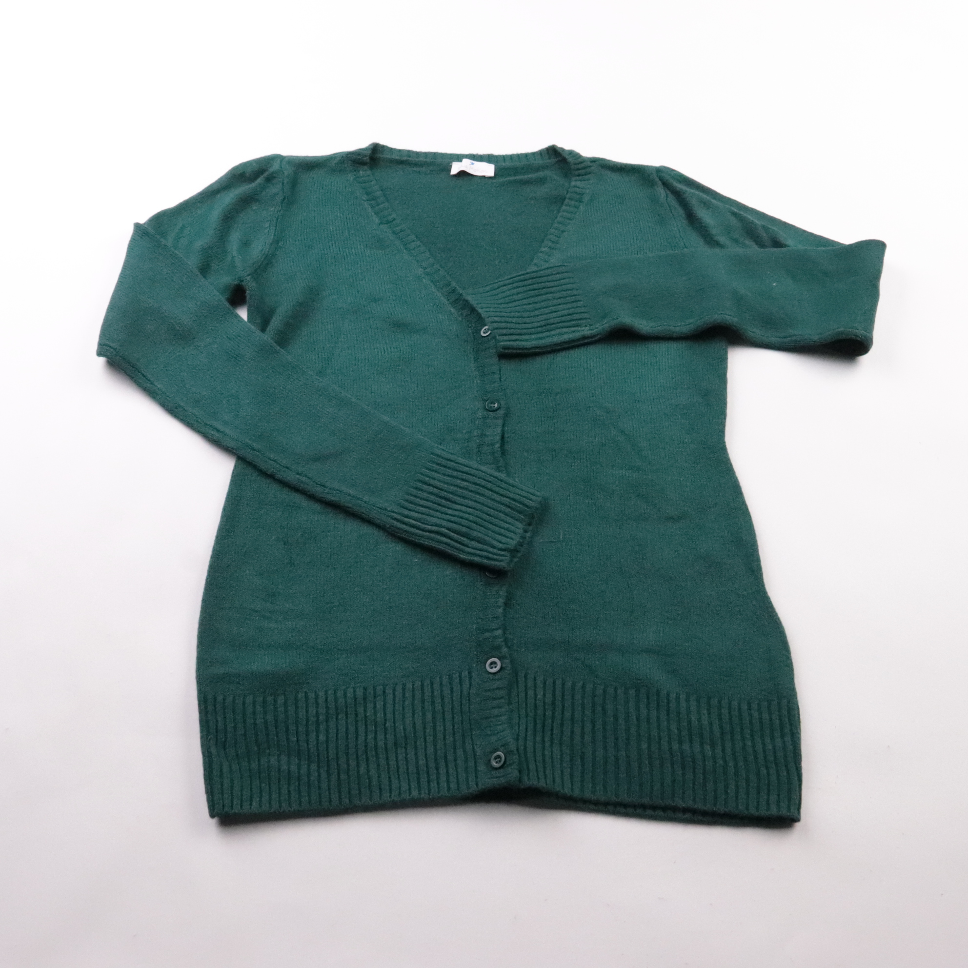 Вязаный кардиган Blue Motion тёмно-зелёного цвета, на пуговицах и с V-образным вырезом. Подойдёт для прохладных дней и удобен для многослойных образов с футболкой или рубашкой. Акриловая вязка простая в уходе и быстро сохнет.