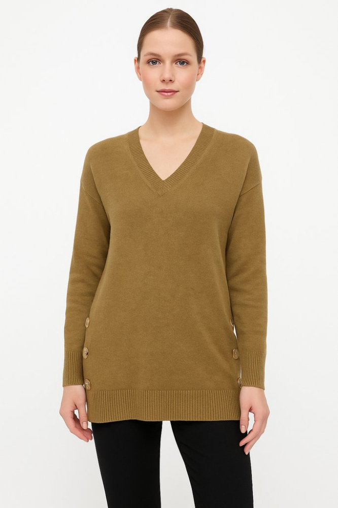 Женский джемпер Tahari с V-образным вырезом и декоративными пуговицами по бокам. Подойдёт для повседневных образов и офиса, легко сочетается с брюками и джинсами. Практичный в уходе: хлопковая смесь, машинная стирка на деликатном режиме.
