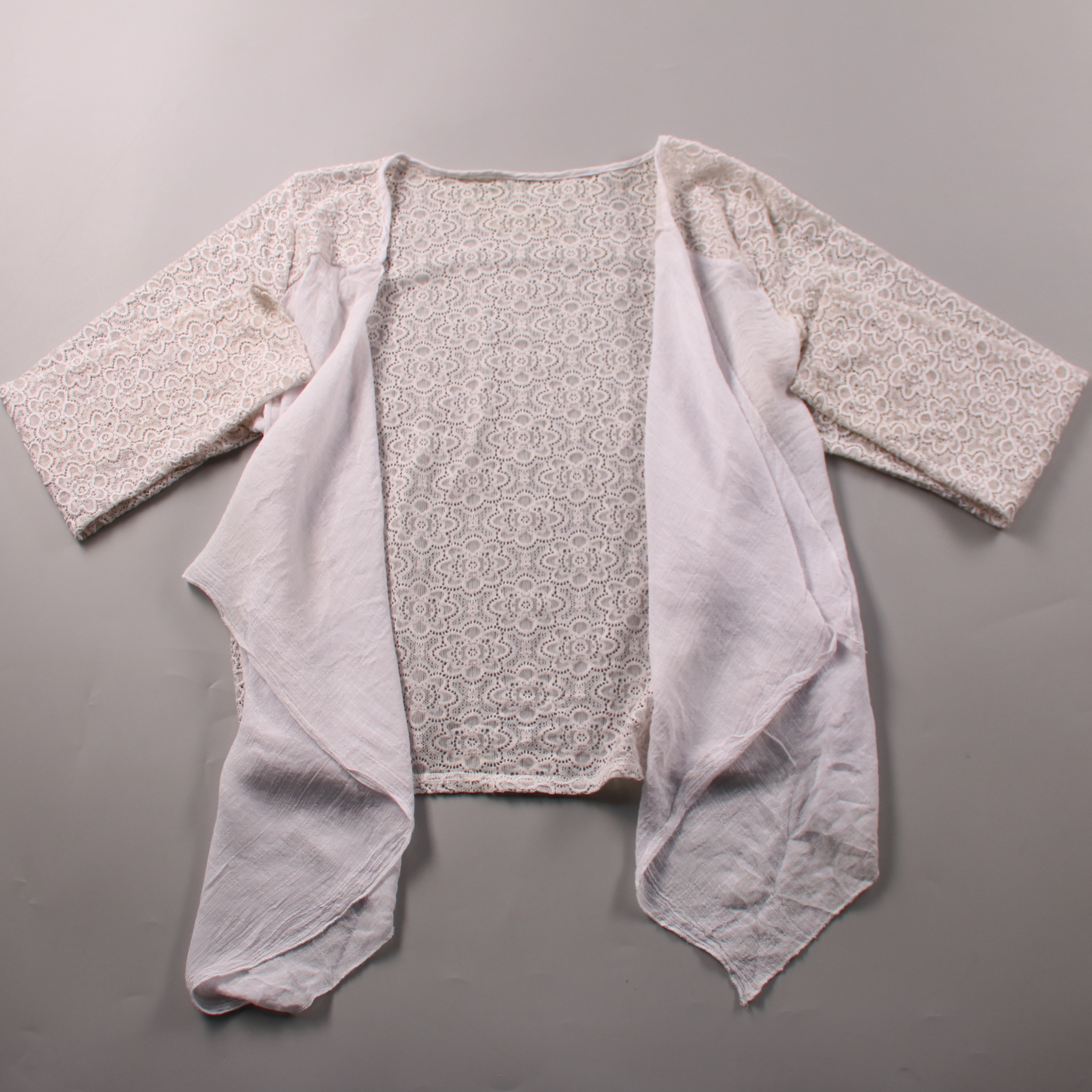 Лёгкий кружевной кардиган без застёжки в белом цвете, с рукавом 3/4 и мягкими драпирующимися полочками. Подойдёт для летних образов поверх топа или платья, в отпуск и на прогулки. Тонкая ткань почти не занимает места в сумке и добавляет слой, когда в п...