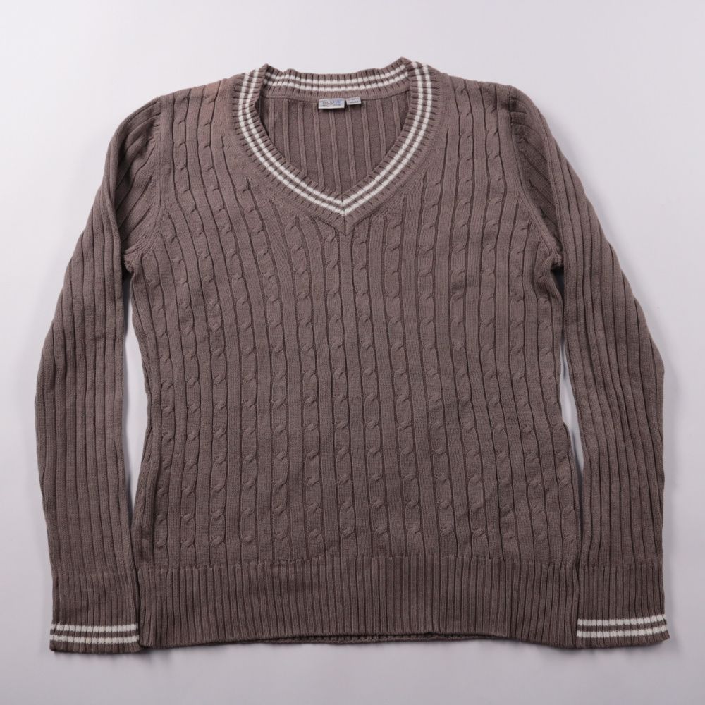Женский джемпер Blue Motion коричневого цвета с V-образным вырезом и фактурной вязкой «косы». Подойдёт для повседневных образов и офиса, хорошо смотрится с джинсами или юбкой. Смесовый состав (хлопок/полиакрил) делает его мягким и простым в уходе.