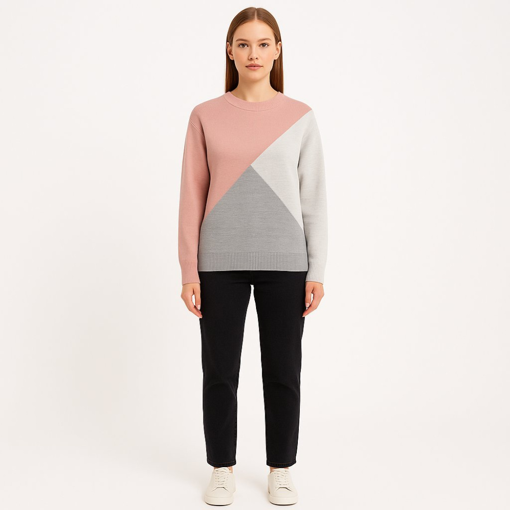 Женский джемпер F&F в геометрическом колор-блоке (розовый/серый/белый) с круглым вырезом и манжетами. Подойдёт для повседневных образов в офис и на прогулки, легко сочетается с джинсами и брюками. Практичный трикотаж комфортно носится под верхней одежд...