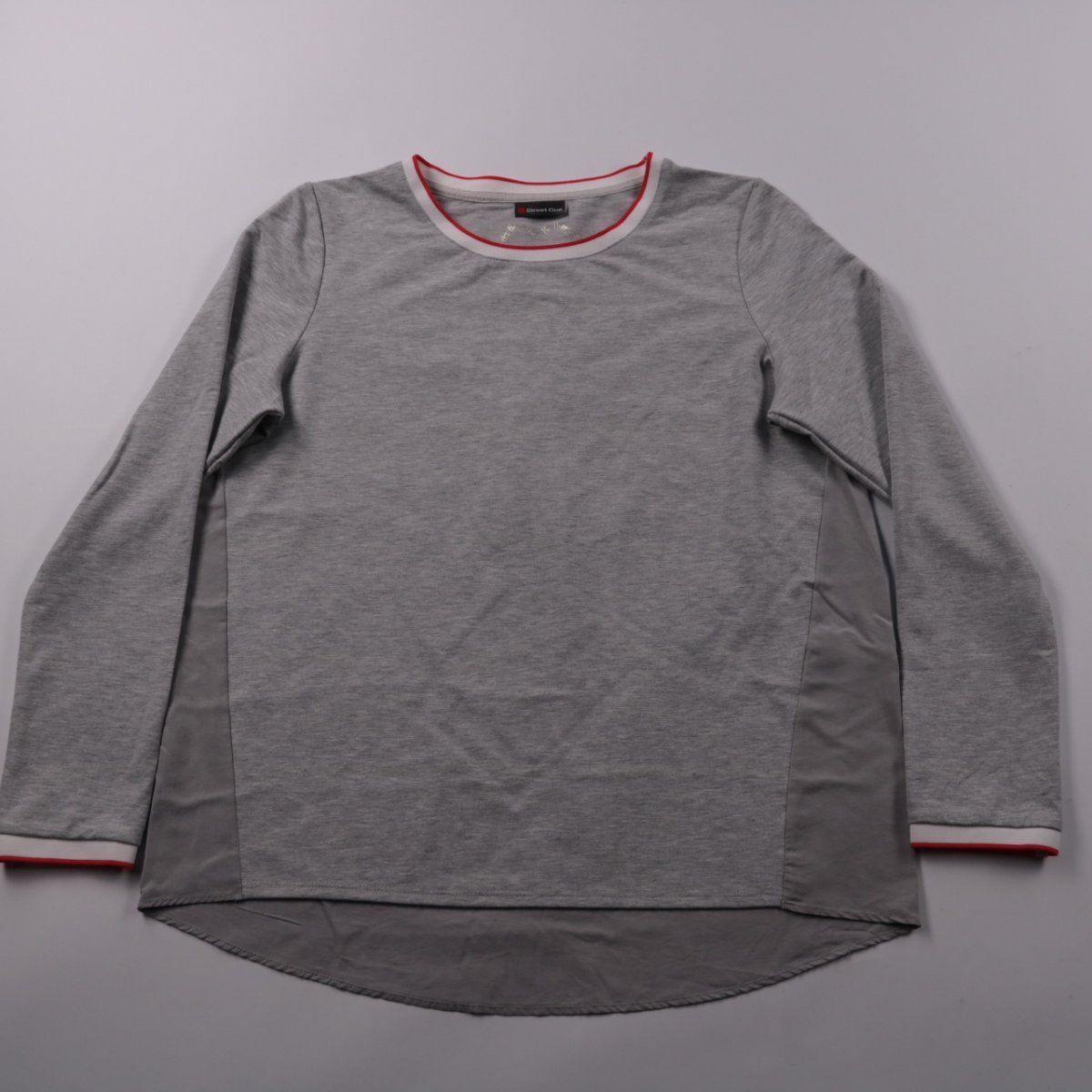 Женская кофта Street One серого цвета с круглым вырезом и длинным рукавом, с отделкой красно-белой окантовкой по горловине и манжетам. Подойдёт для повседневных образов и офиса в прохладную погоду, хорошо сочетается с джинсами и брюками. Практичное преимущество — эластичный материал и удлинённая спинка, за счёт чего комфортно сидит и не стесняет движений.
