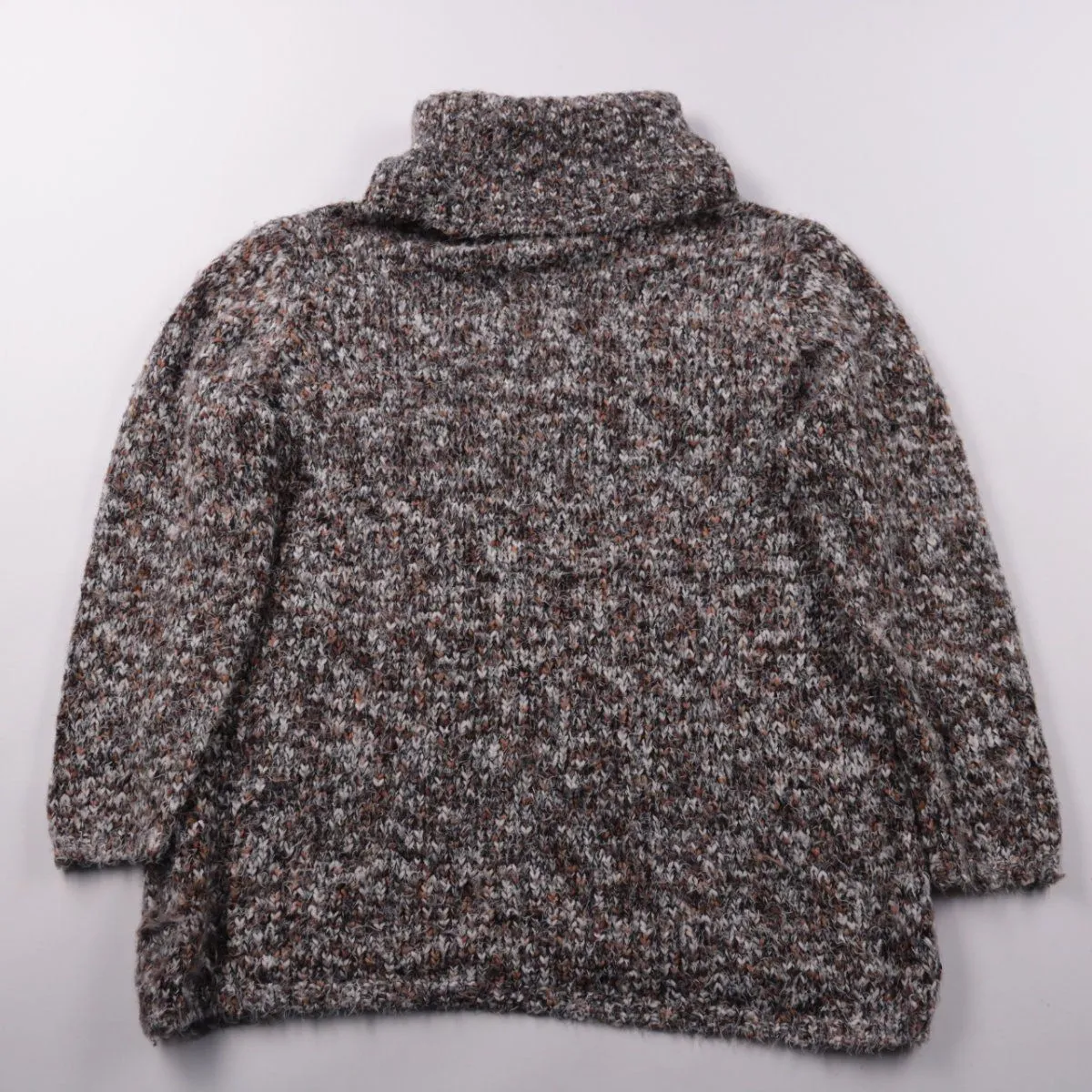 Женский свитер крупной вязки с высоким воротником, мягкий меланж серо-коричневого оттенка. Подойдёт для прохладной погоды и многослойных образов с джинсами или юбкой. Плотная фактура хорошо держит тепло и не требует сложного ухода.