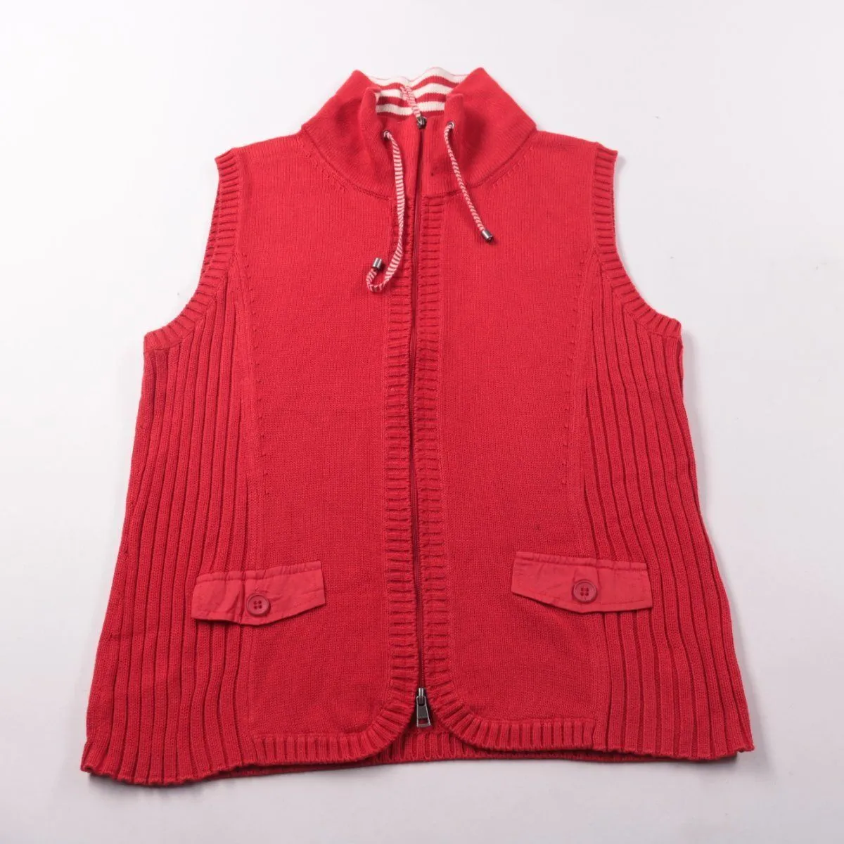 Вязаный жилет-кардиган Olsen красного цвета с молнией, высоким воротником и карманами. Удобно носить как второй слой в прохладную погоду или в помещении. Практичный плюс — застёжка-молния позволяет быстро регулировать тепло и посадку.