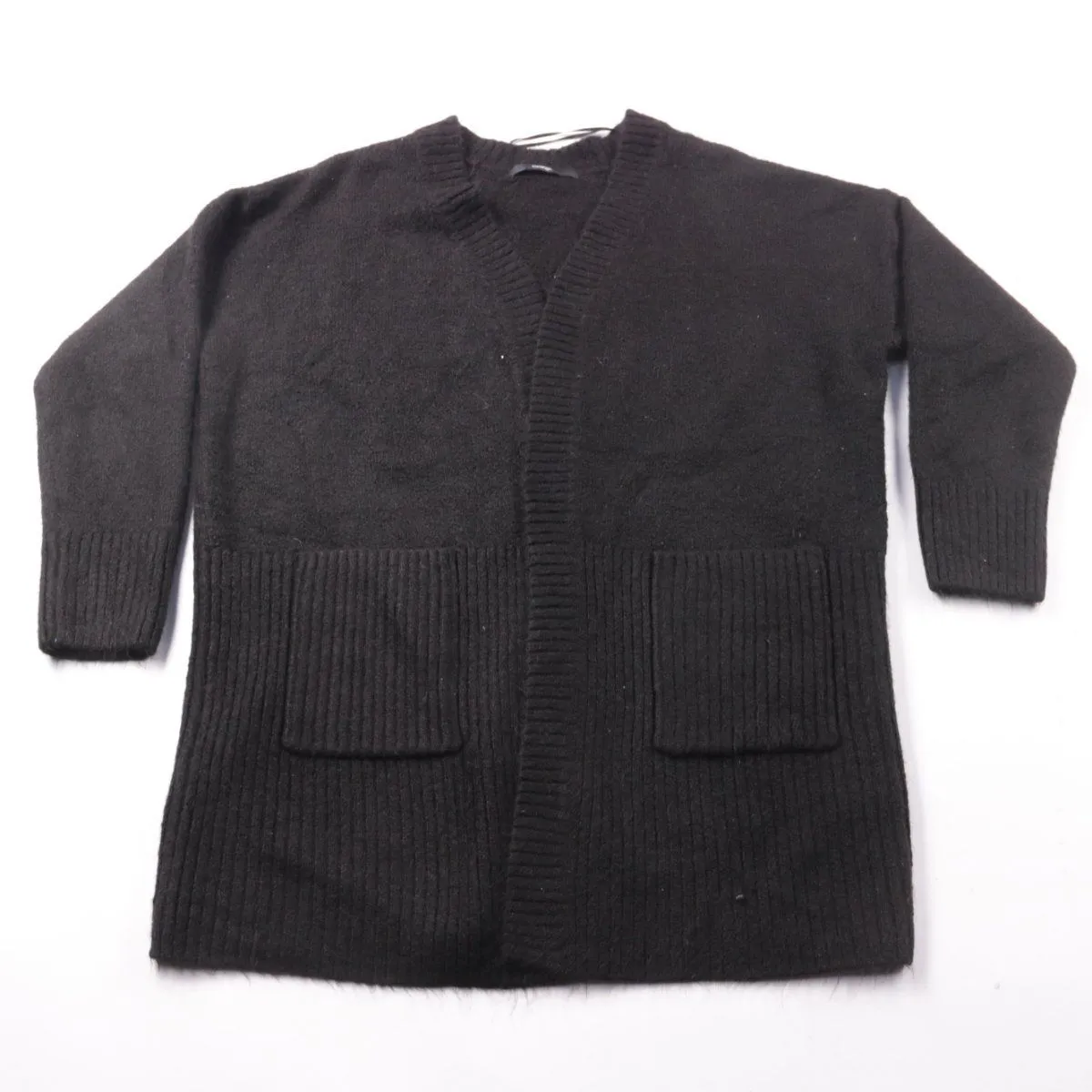 Вязаный кардиган George чёрного цвета с V-образным вырезом и без застёжки, с накладными карманами. Подойдёт для повседневных образов и как дополнительный слой в прохладную погоду. Практичный плюс — вместительные карманы спереди.