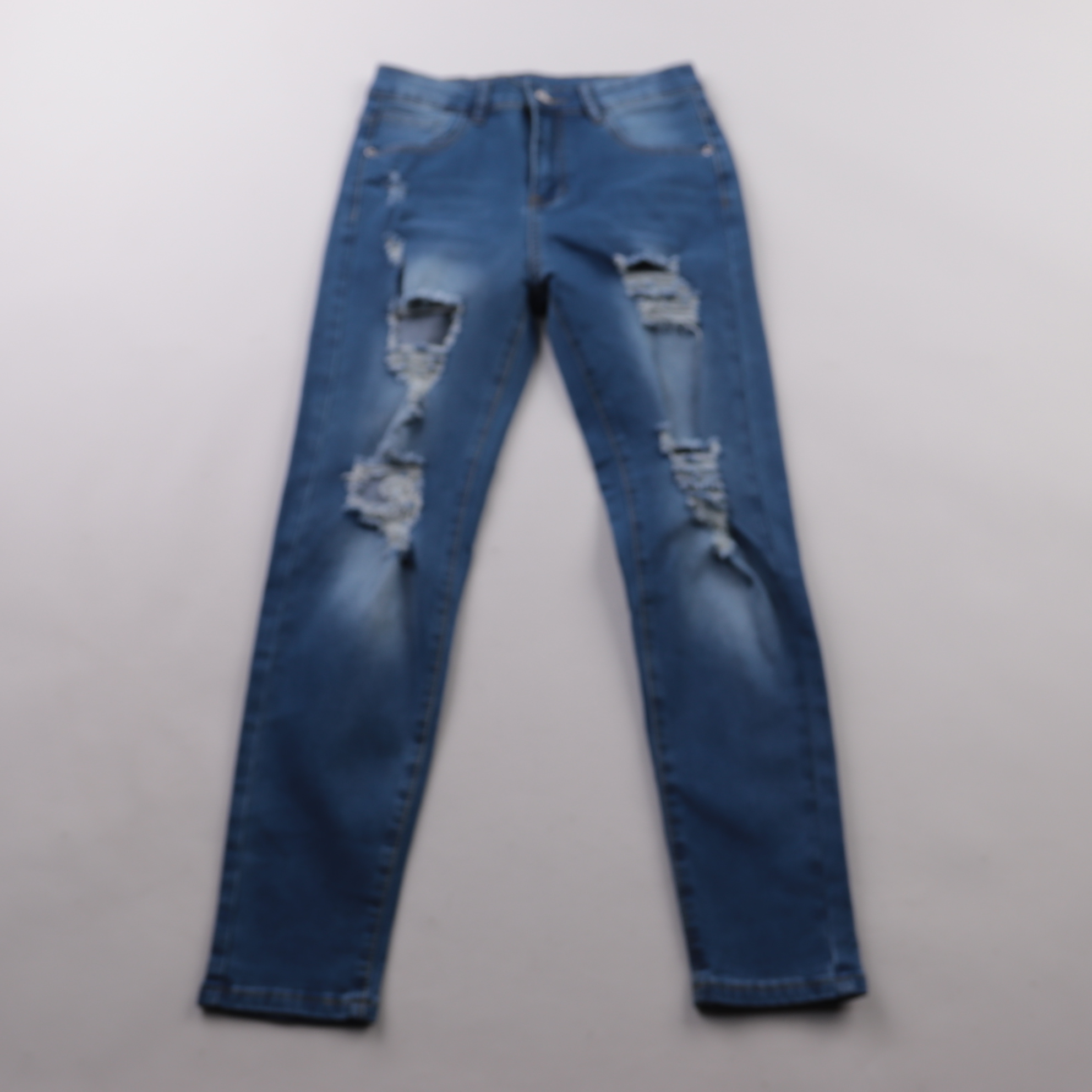 Джинсы Shein синего цвета с декоративными потертостями и разрезами. Подойдут для повседневных образов с футболками, худи и кедами. Эластичная ткань лучше садится по фигуре и комфортна в носке.