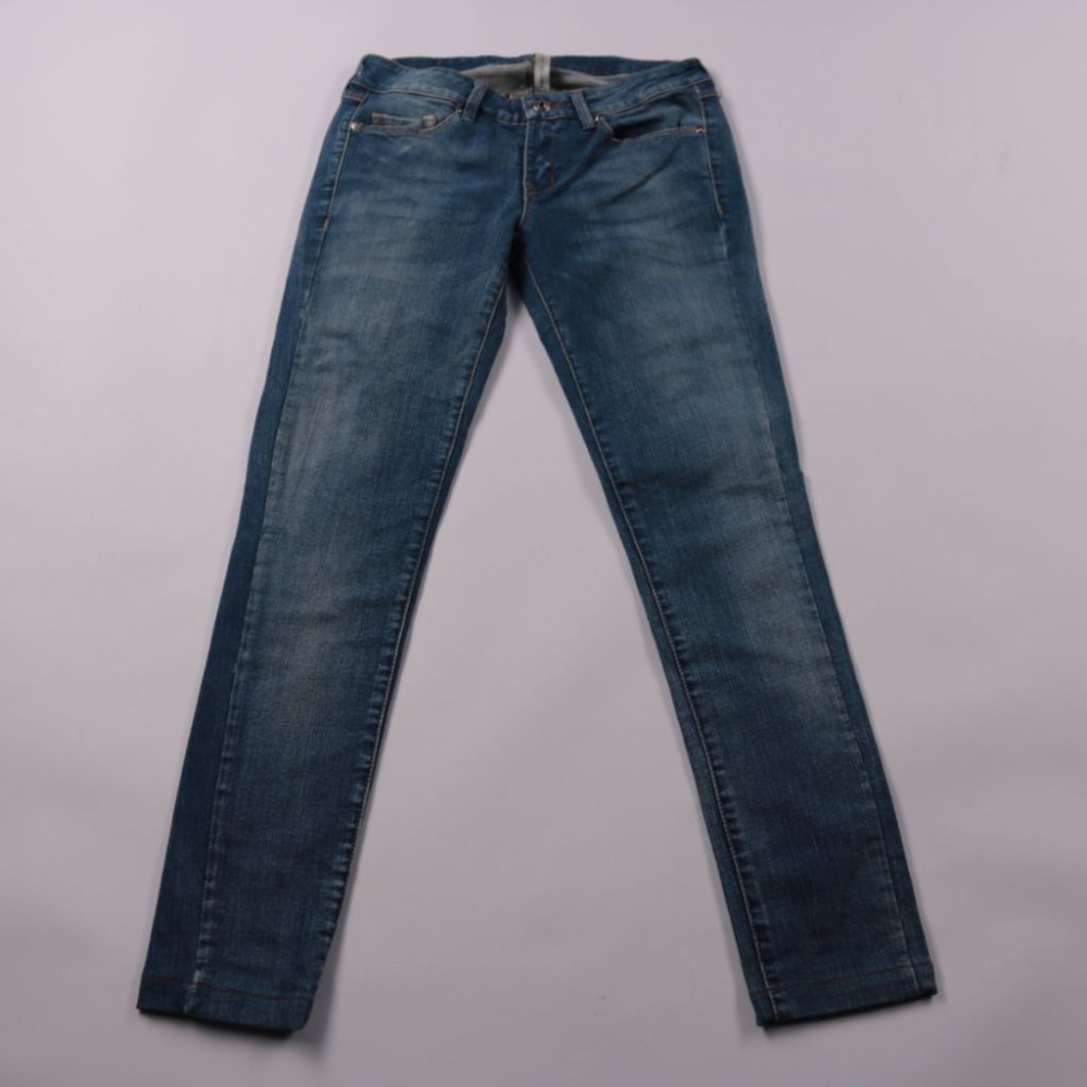 Женские джинсы Mango синего цвета с лёгкими потёртостями. Подойдут для повседневных образов и сочетания с кедами или ботинками. Благодаря добавлению эластана ткань немного тянется и комфортно садится по фигуре.