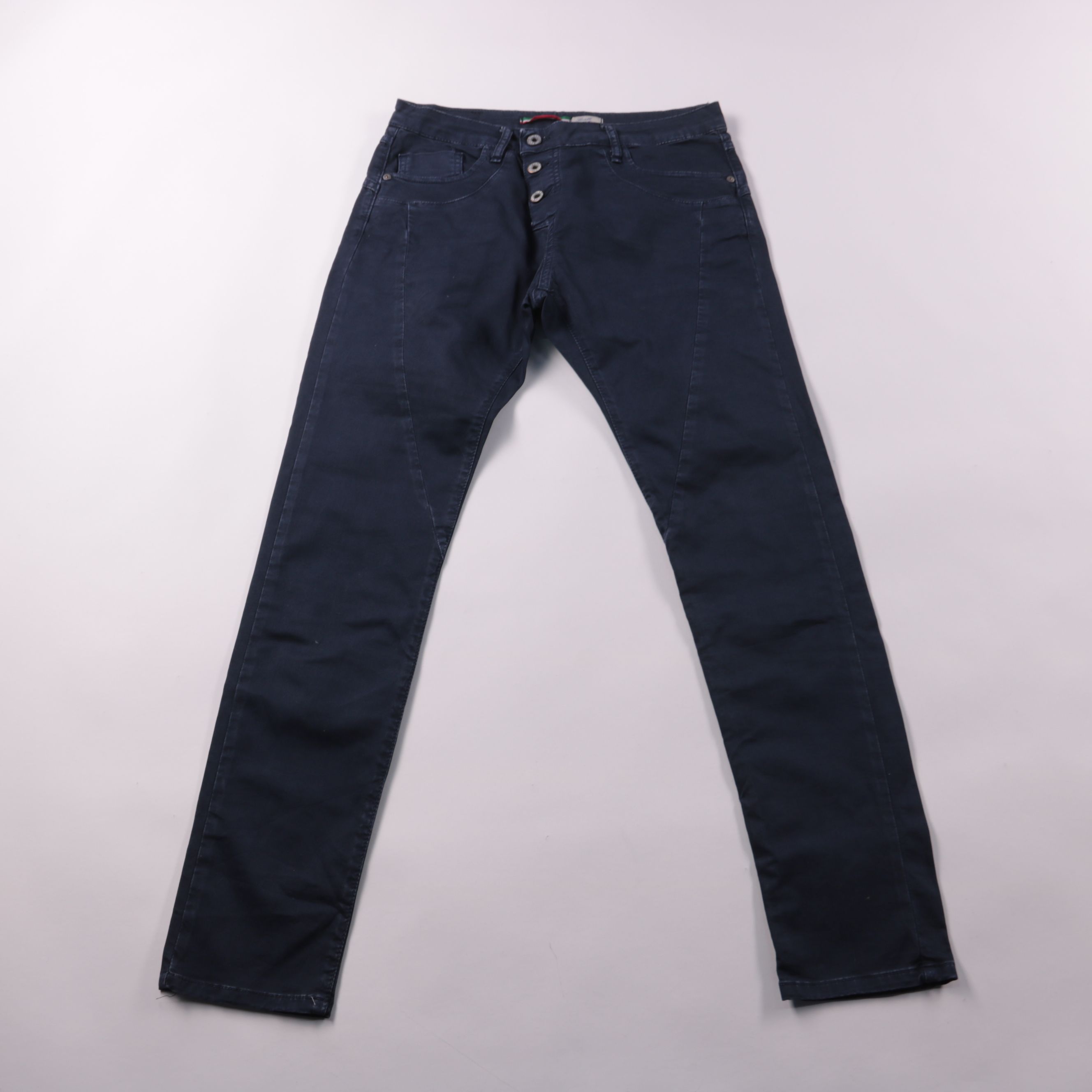 Мужские джинсы PLEASE тёмно-синего цвета с застёжкой на пуговицы и классическими карманами. Подойдут для повседневной носки и офисных образов в стиле casual. Плотная ткань держит форму и удобно садится по фигуре.