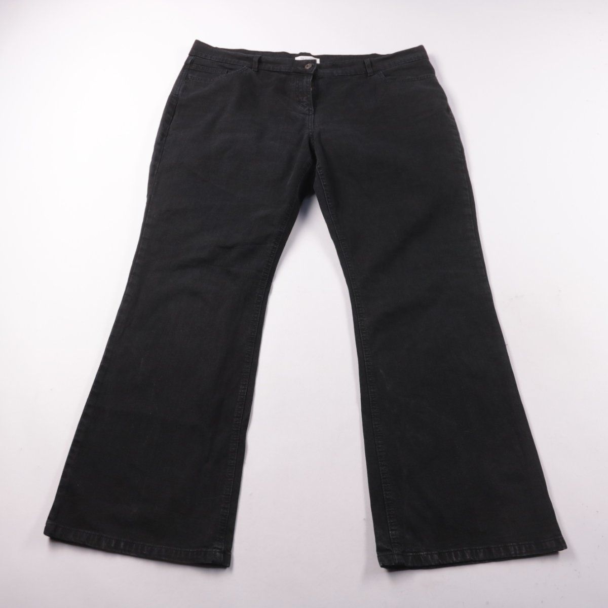 Женские чёрные джинсы M&S в модели bootleg (слегка расклёшенные от колена). Подойдут для повседневных образов и офиса благодаря однотонному цвету. Плотный хлопок с добавлением эластана даёт комфортную посадку и небольшую эластичность.