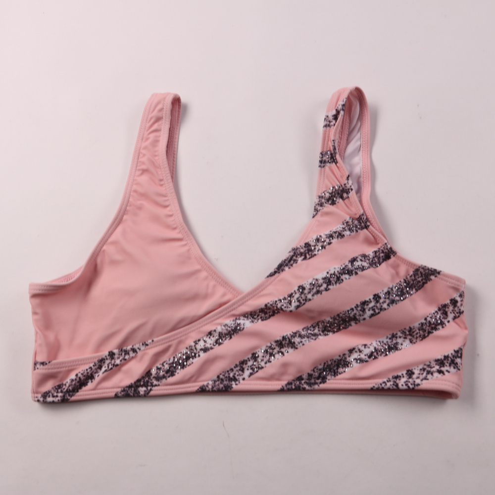 Женский купальный топ в нежно-розовом цвете с диагональными полосами с блестящим эффектом. Подойдёт для пляжа и бассейна, хорошо сочетается с однотонными плавками. Эластичная ткань быстро сохнет и комфортно сидит по фигуре.