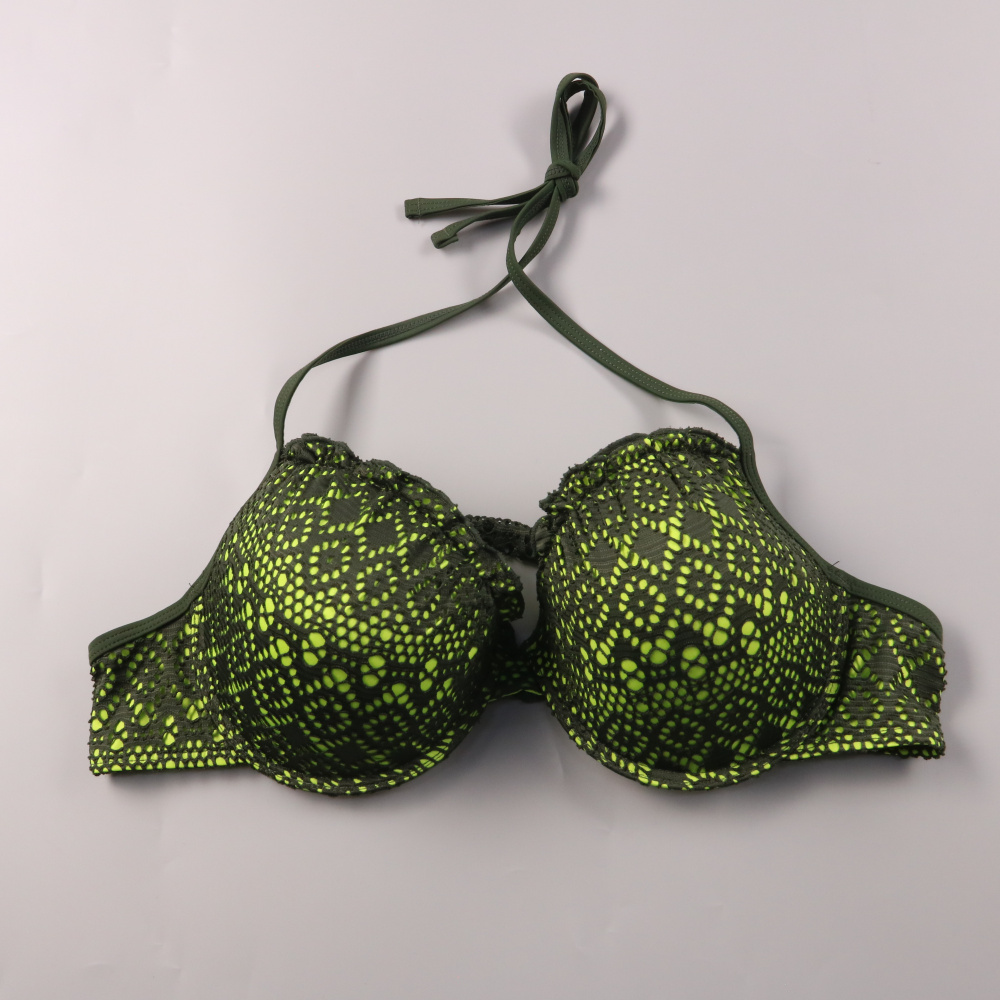 Купальный топ (лиф) Janina в зелёной расцветке с кружевным эффектом и завязками на шее. Подойдёт для пляжа и бассейна, хорошо держит форму за счёт плотных чашек и косточек.