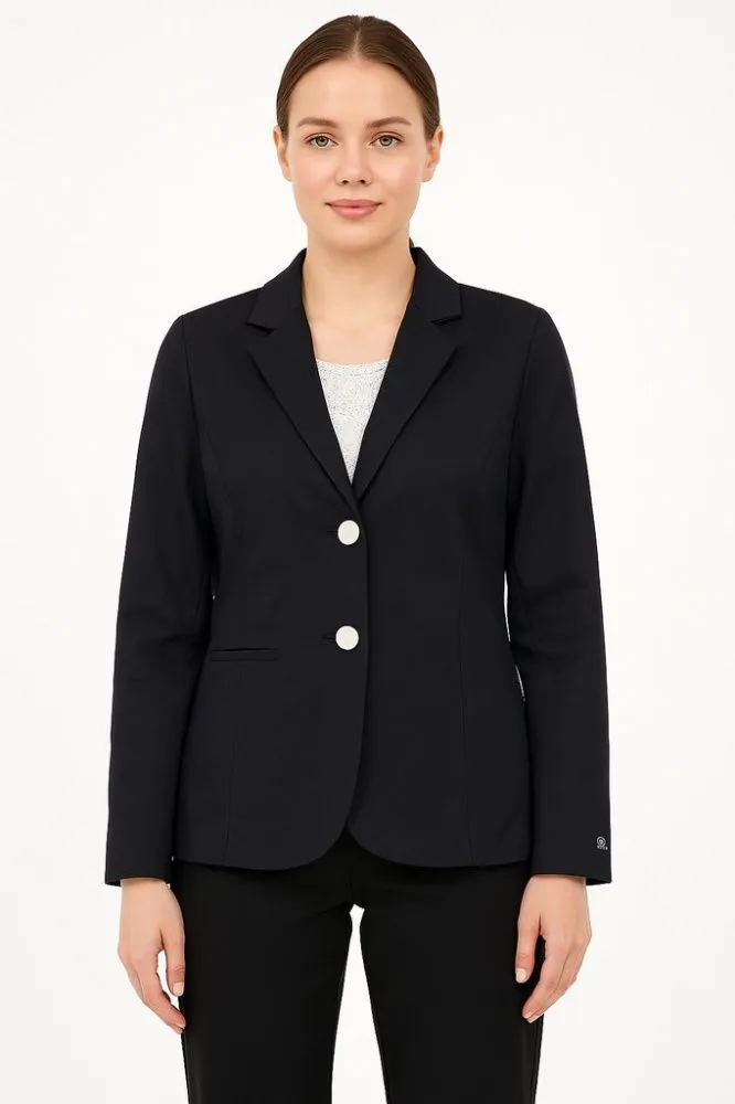 Женский пиджак Tramontana чёрного цвета с классическими лацканами и контрастными пуговицами. Подойдёт для офиса и деловых встреч, легко сочетается с брюками или юбкой. Практичный вариант: тёмный цвет немаркий и универсальный.