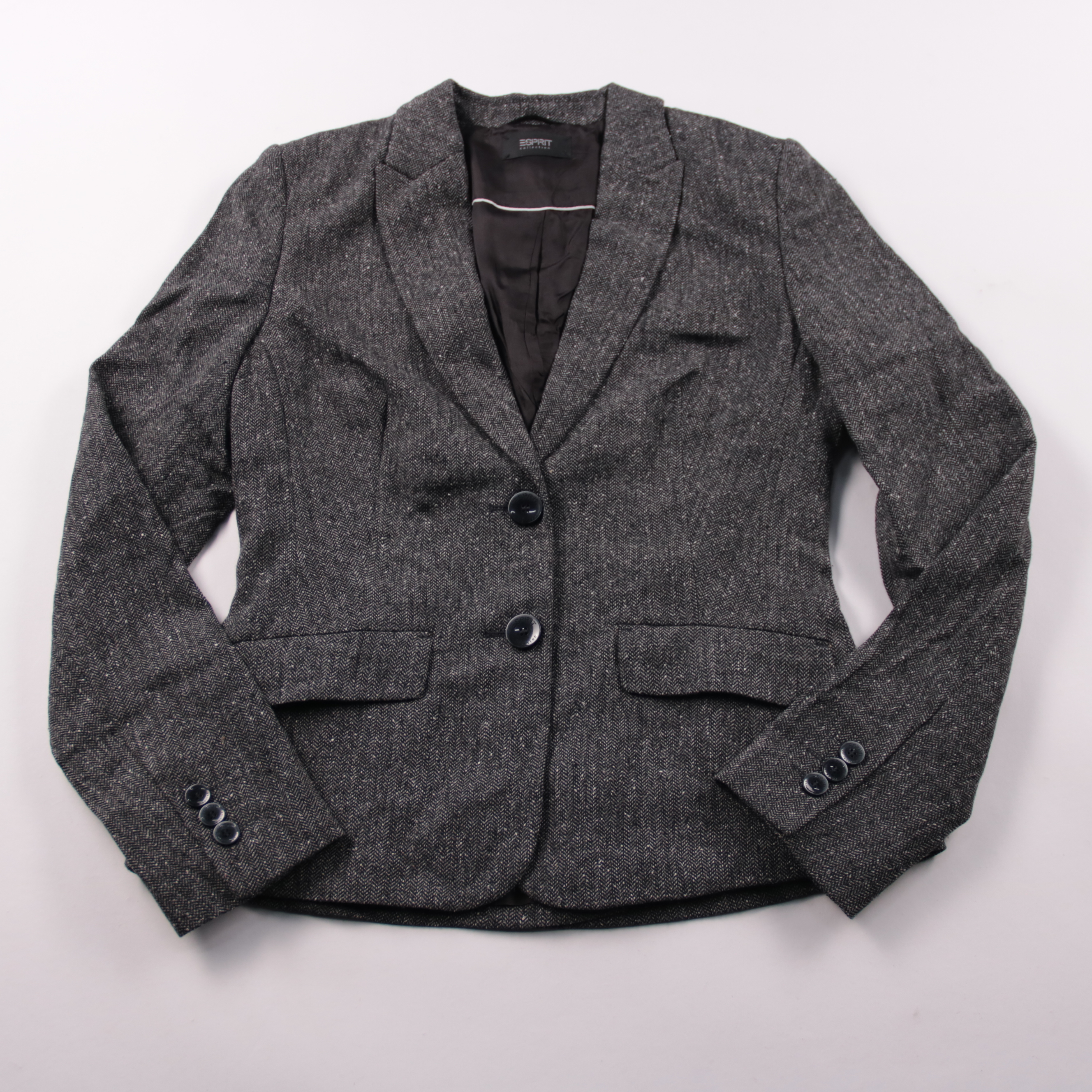 Женский пиджак Esprit из плотной ткани с узором «ёлочка», на двух пуговицах и с отложным воротником. Подойдёт для офиса и повседневных образов в прохладную погоду, легко сочетается с джинсами и классическими брюками. Есть подкладка, поэтому держит форм...