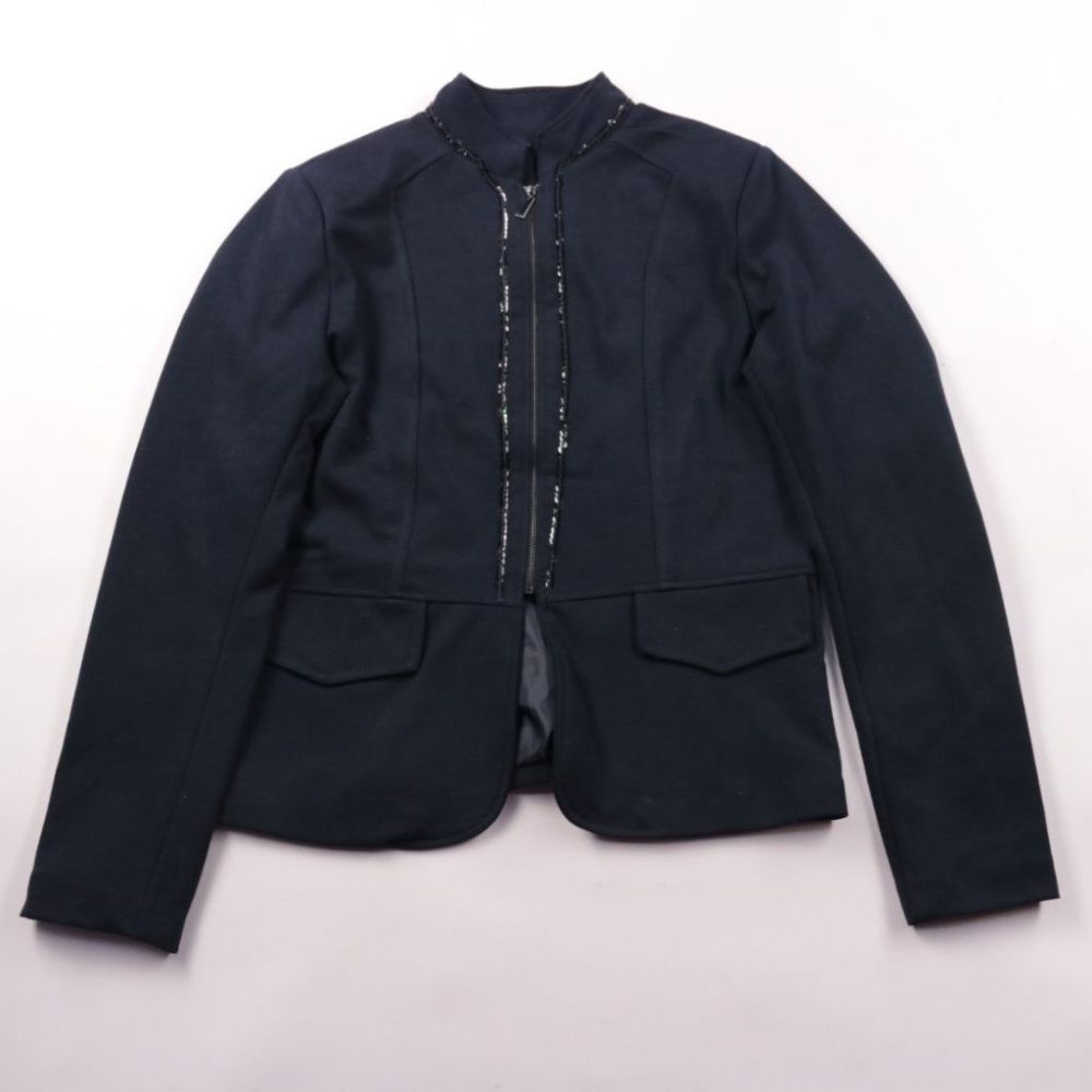 Женский укороченный пиджак без бренда, чёрного цвета, с застёжкой на молнию и декоративной отделкой по планке. Подойдёт для офиса и на выход, хорошо сочетается с платьем или брюками. Лёгкая подкладка добавляет комфорта и помогает пиджаку держать форму.