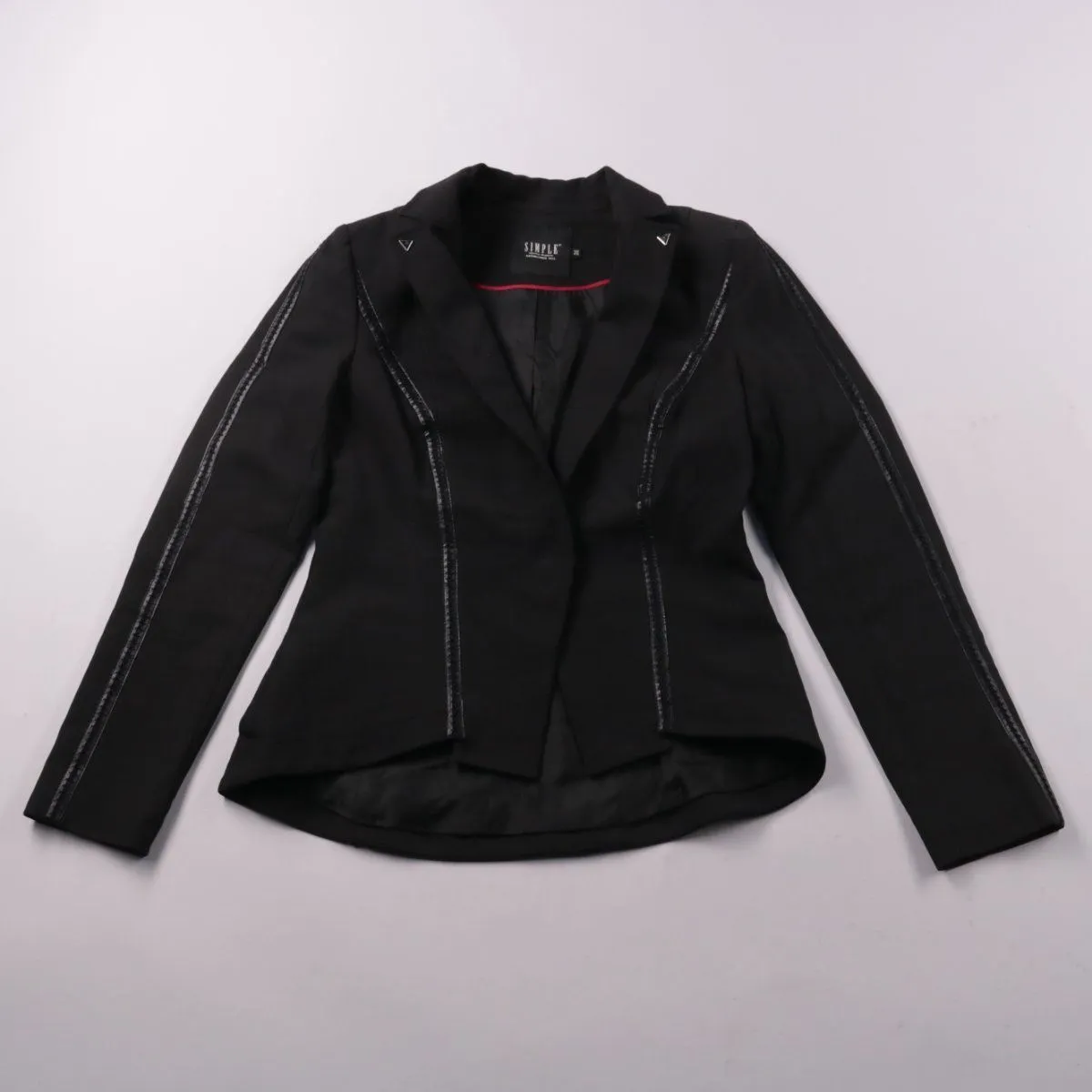 Женский приталенный пиджак Simple в чёрном цвете с декоративными контрастными строчками по линиям рельефов и рукавам. Подойдёт для офиса и деловых/вечерних образов, хорошо смотрится с брюками и юбками. Смесовая ткань с эластаном комфортнее в носке и меньше сковывает движения.