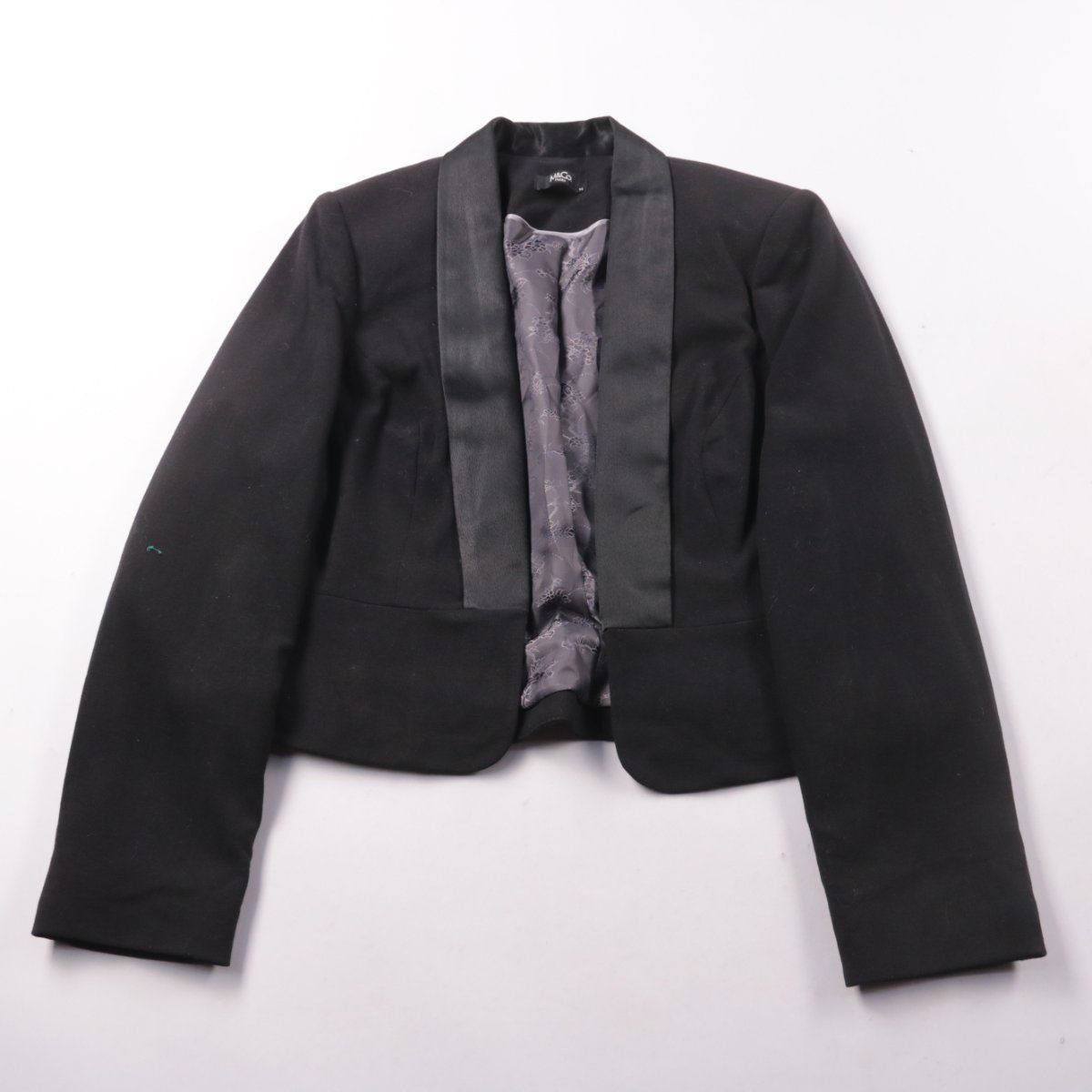 Укороченный женский пиджак M&Co. с атласными лацканами и подкладкой с узором. Подойдёт для вечерних образов и мероприятий, хорошо сочетается с платьями и брюками с высокой посадкой. Лёгкий и компактный, удобно брать с собой как накидку.