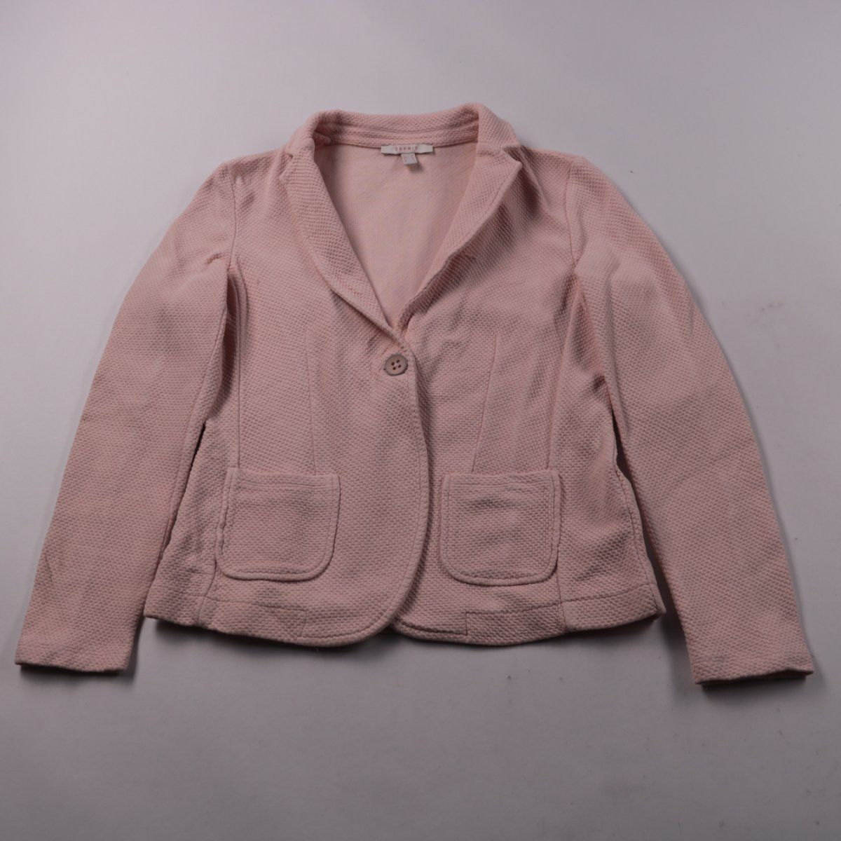 Женский пиджак Esprit пудрово-розового цвета с фактурной тканью и застёжкой на пуговицу. Подойдёт для офиса и повседневных образов в прохладную весну или летний вечер. Хлопковый материал приятен к телу и хорошо дышит.