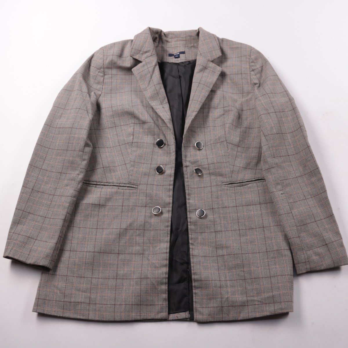 Женский пиджак Kiabi в серую клетку, двубортный, на подкладке. Подойдёт для офиса и повседневных образов с джинсами или брюками. Практичный плюс — есть карманы и плотная ткань держит форму.
