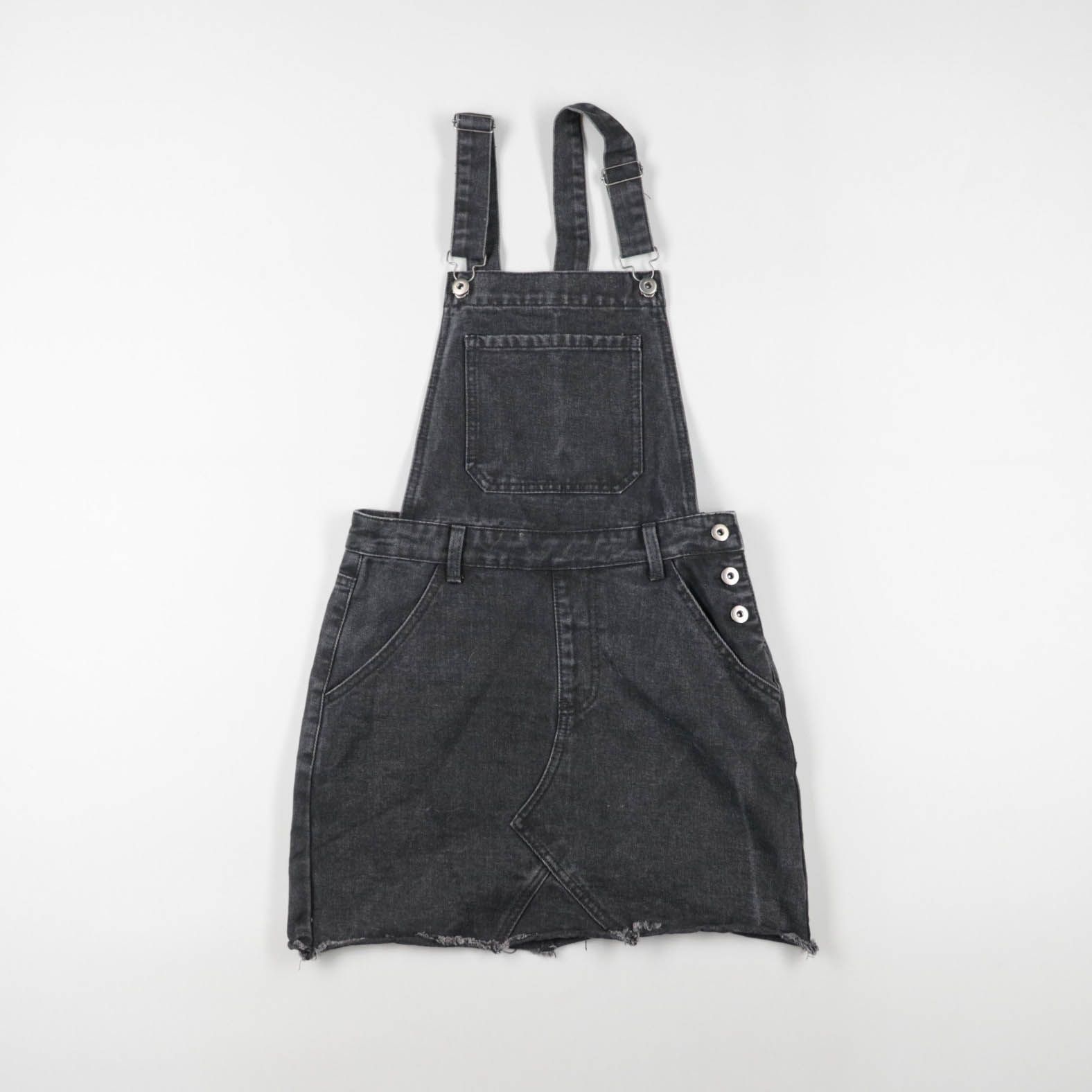 Джинсовый сарафан-комбинезон в вываренном чёрном цвете с регулируемыми лямками и накладными карманами. Подойдёт для повседневных летних образов с футболкой или топом и кедами/сандалиями. Плотный деним хорошо держит форму и практичен в носке.