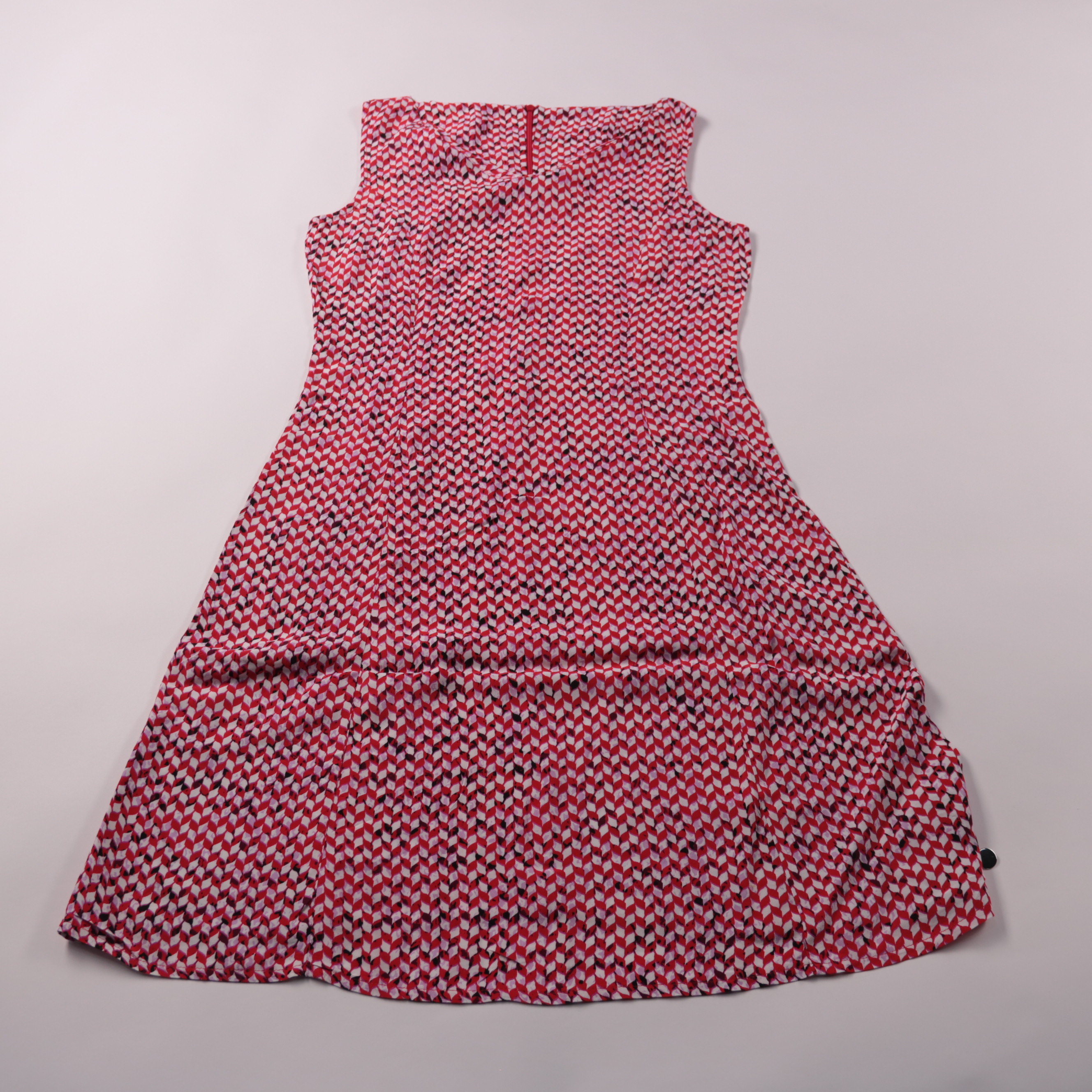 Летнее повседневное платье Street One без рукавов, с мелким геометрическим принтом в красно-бело-чёрной гамме. Подойдёт для города и отпуска, хорошо сочетается с кедами или сандалиями. Лёгкая вискоза приятно ощущается на коже и комфортна в жару.
