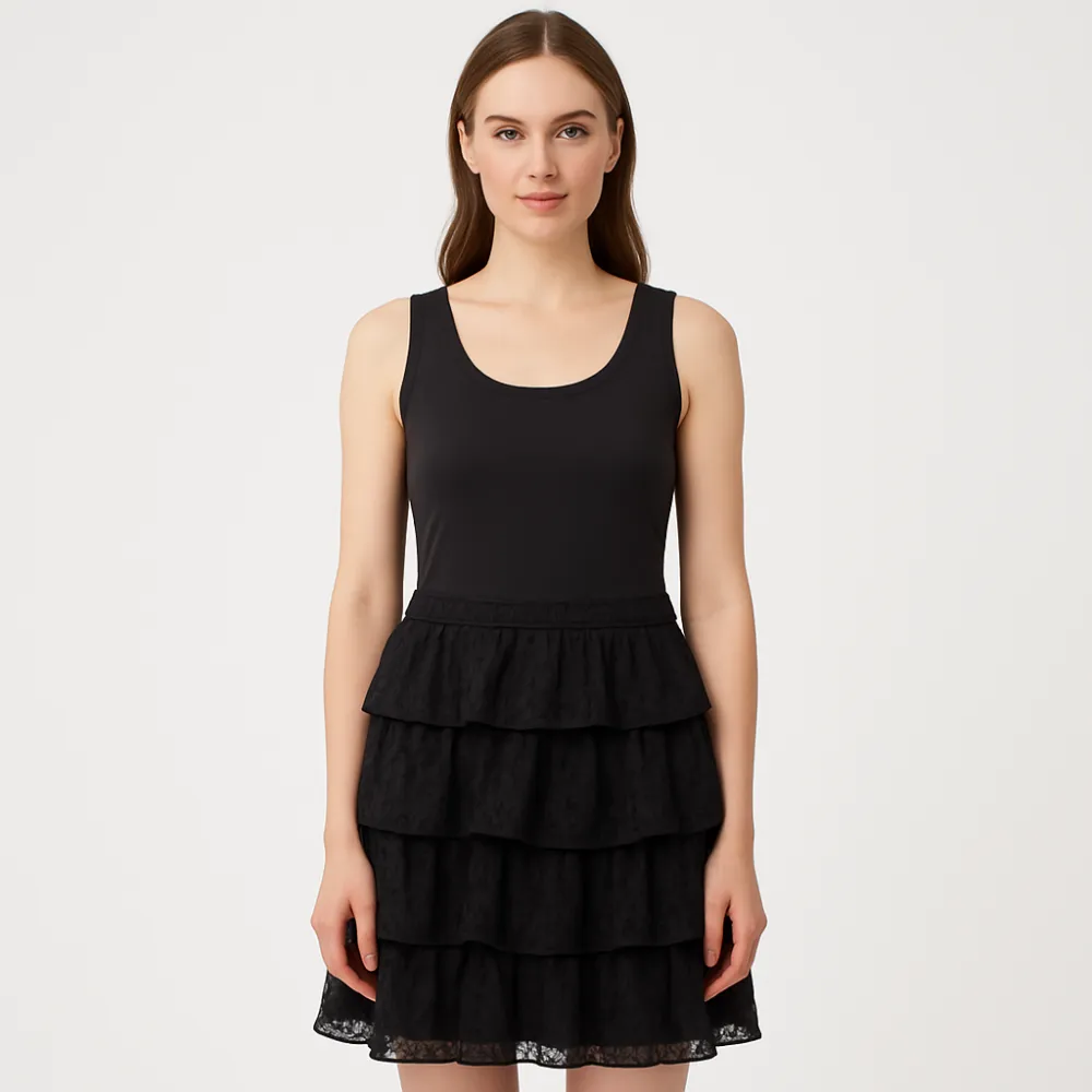 Женское чёрное платье EDC (edc by esprit) с лаконичным верхом-майкой и ярусной юбкой. Подойдёт для повседневных образов и летних прогулок, легко сочетается с кедами или босоножками. Практичный плюс — универсальный цвет и свободная посадка по юбке, не с...
