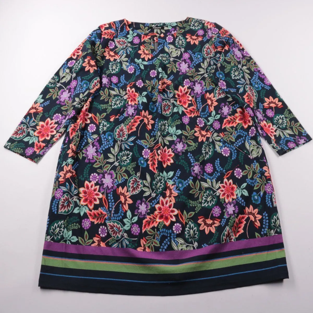 Повседневное платье Walbusch тёмно-синего цвета с ярким цветочным принтом и декоративными полосами по низу. Подойдёт для офиса и на каждый день, хорошо смотрится с однотонными кардиганами и жакетами. Ткань с добавлением эластана немного тянется и комфортна в носке.