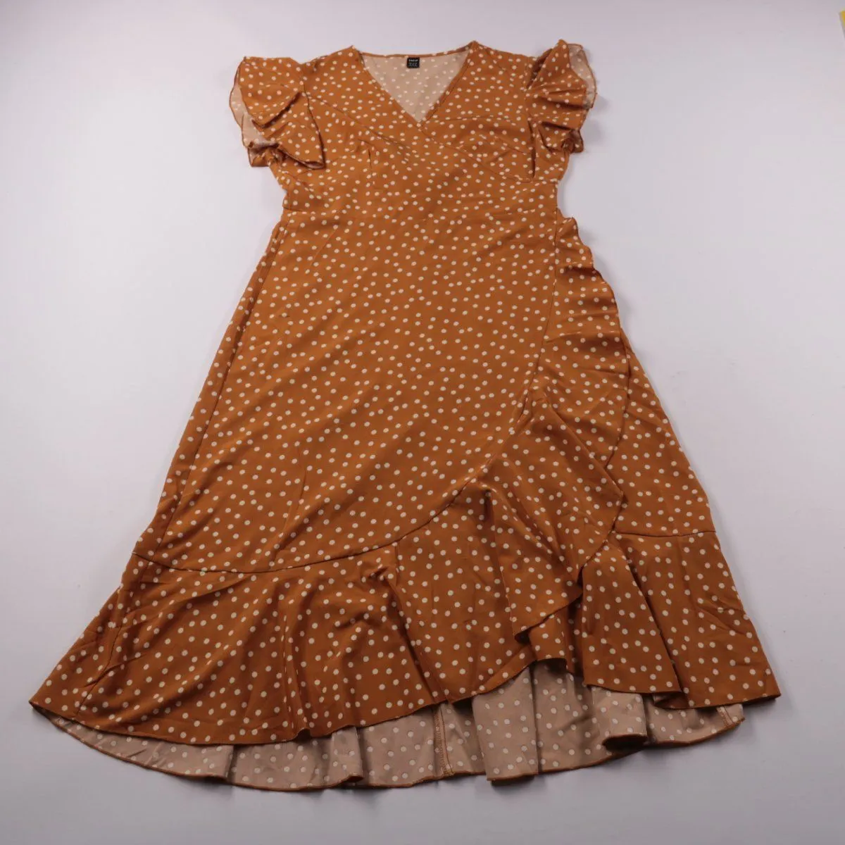 Повседневное платье Shein коричневого цвета в белый горох, с V-образным вырезом и рукавами-крылышками. Подойдёт для прогулок и повседневных образов в тёплую погоду; есть пояс и воланы по низу. Практичный плюс — лёгкая ткань почти не мнётся и быстро сохнет.