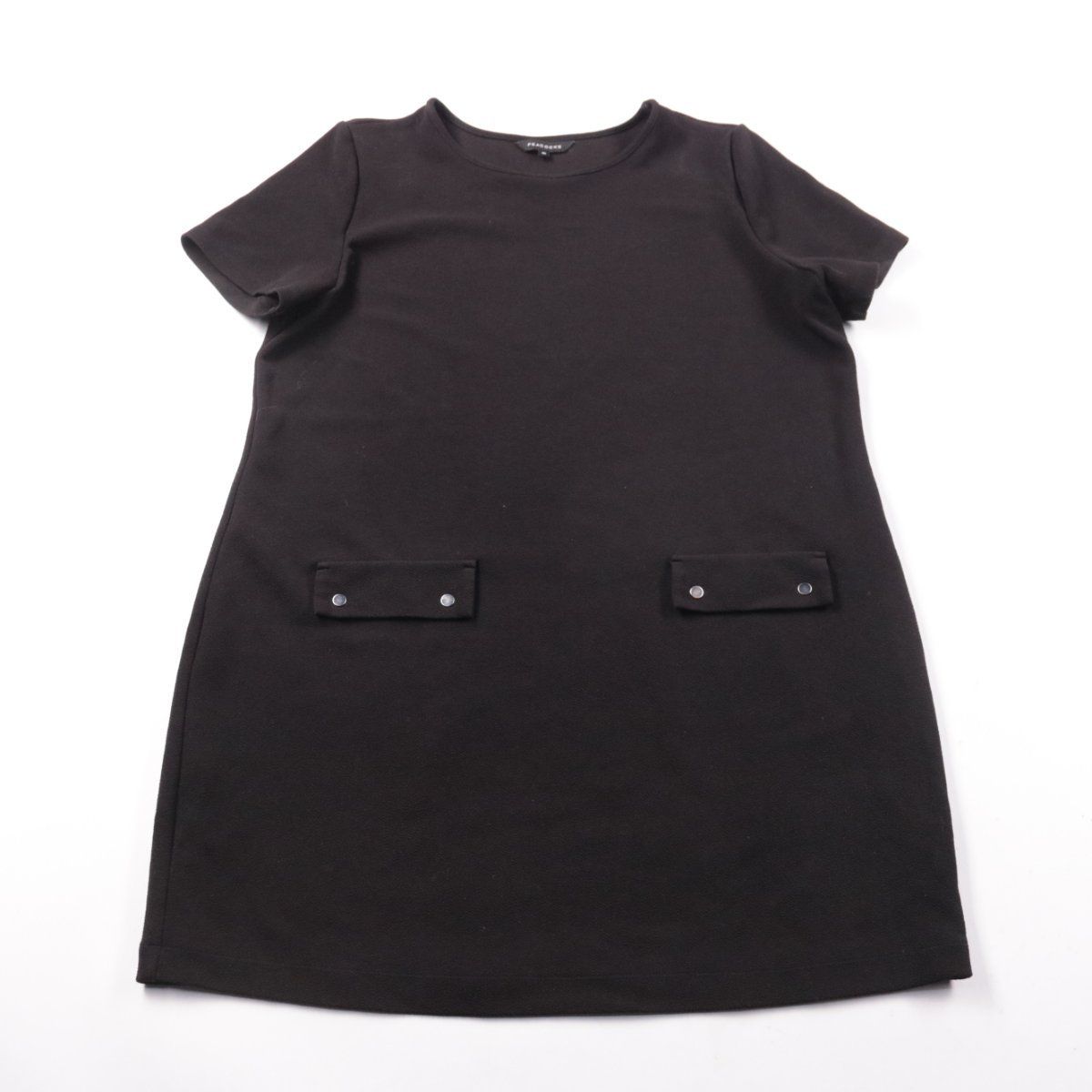 Повседневное платье Peacocks прямого кроя, чёрного цвета, с коротким рукавом и накладными карманами на кнопках. Подойдёт для офиса и на каждый день, легко сочетается с жакетом или кроссовками. Ткань со стрейчем даёт комфортную посадку и не сковывает движения.