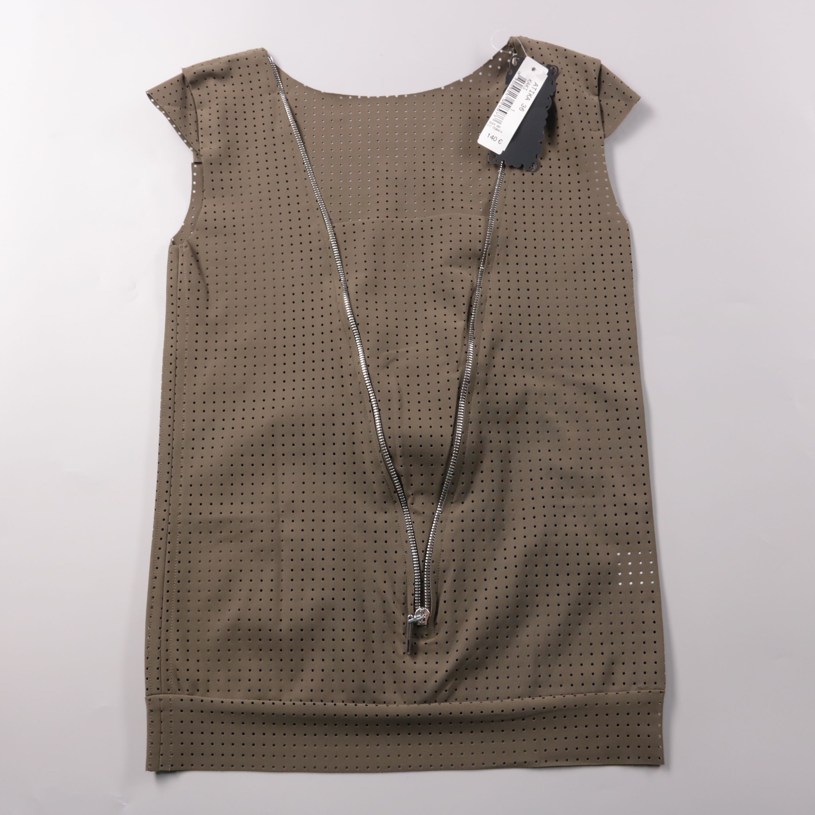 Повседневное платье Suggest прямого кроя из перфорированного материала с глубоким V‑образным вырезом на молнии. Подойдёт для летних образов и как слой поверх топа/майки. Эластичная ткань хорошо тянется и комфортно садится по фигуре.