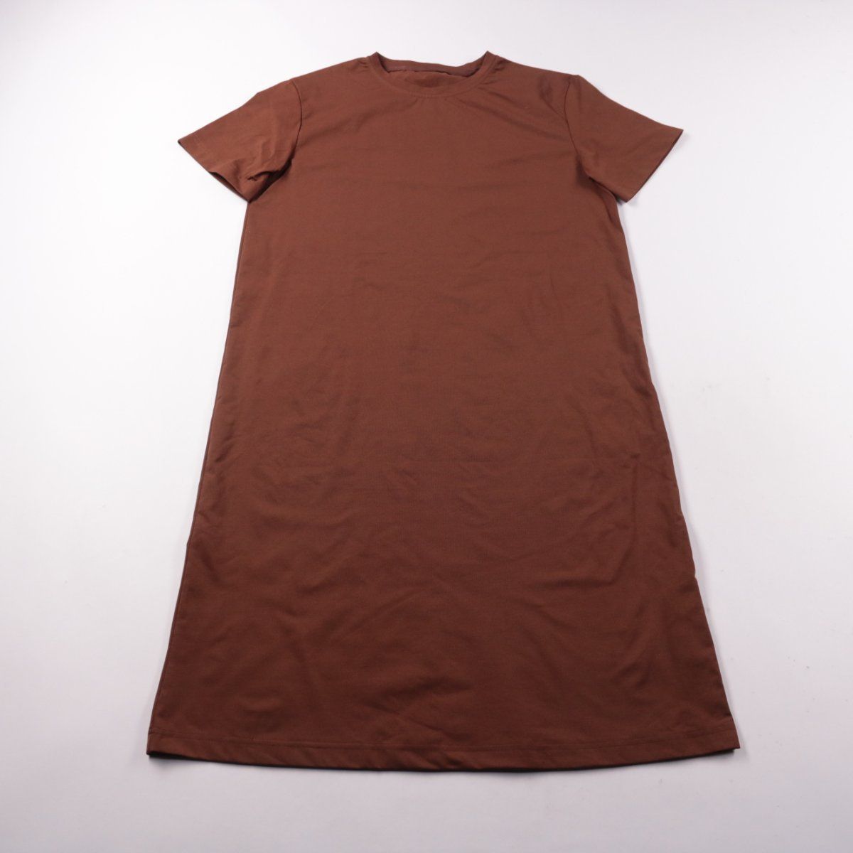Повседневное платье-футболка Dazy в коричневом цвете, прямого кроя с круглым вырезом и коротким рукавом. Подойдёт для летних прогулок и поездок, легко сочетается с кедами или сандалиями. Практичное преимущество — мягкий трикотаж и простой уход.