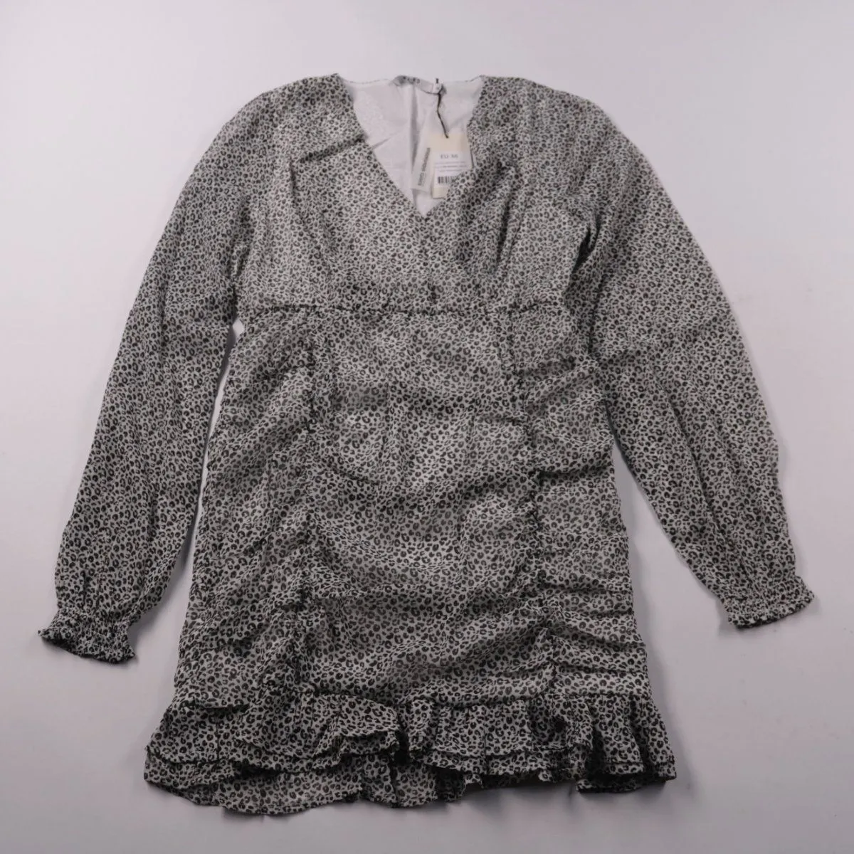 Женское платье NA-KD с леопардовым принтом, V-образным вырезом и длинными рукавами. Модель с драпировкой по бокам и оборкой по низу подойдёт для повседневных образов и выхода вечером. Плотная посадка подчёркивает силуэт и не требует сложных сочетаний в образе.