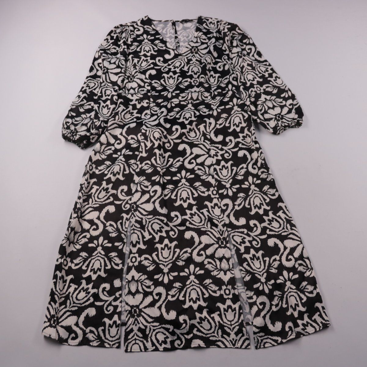 Повседневное платье F&F с чёрно-белым цветочным принтом и V-образным вырезом. Подойдёт для городских образов и офиса с базовой обувью и жакетом. Ткань выглядит лёгкой, а свободный крой не стесняет движения.