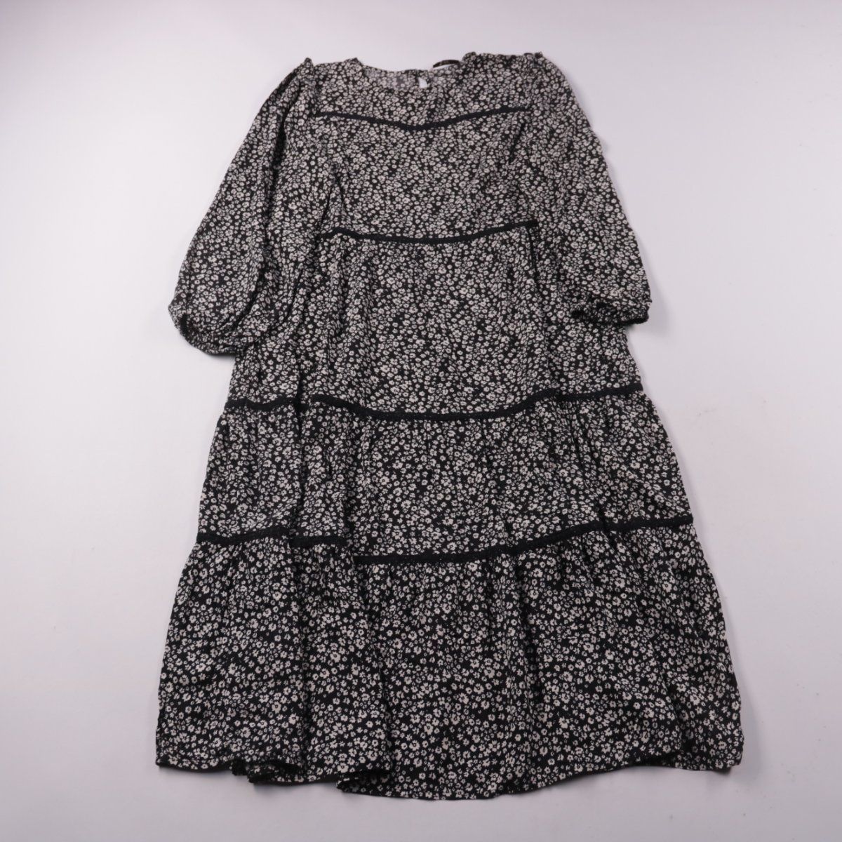 Повседневное платье TU Woman чёрного цвета с мелким белым цветочным принтом, многоярусной юбкой и объёмными рукавами. Подойдёт для прогулок и на каждый день, хорошо сочетается с ботинками или кедами. Свободный крой комфортен в носке и не стесняет движений.