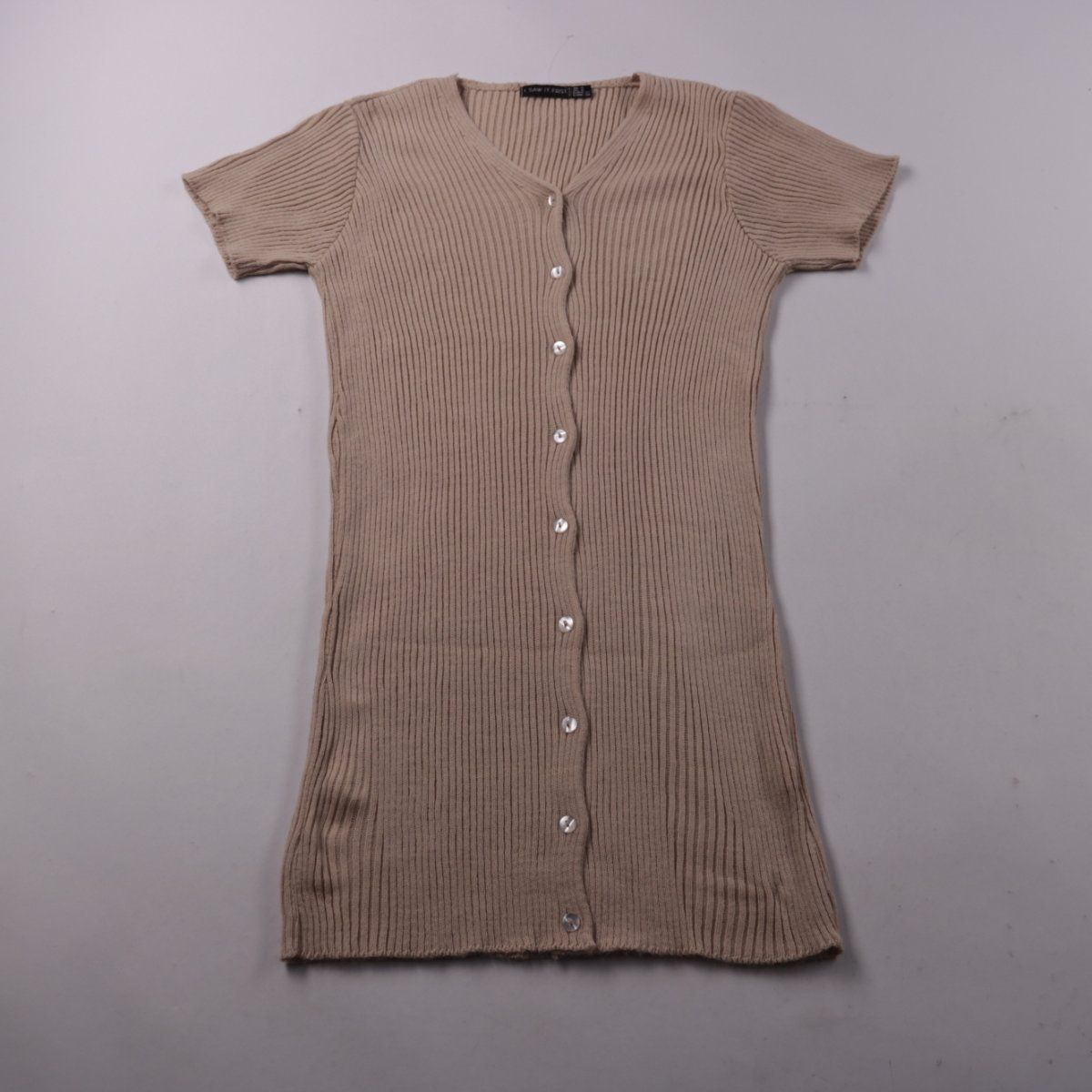 Повседневное трикотажное платье I SAW IT FIRST в бежевом цвете, в рубчик, с V-вырезом и застёжкой на пуговицы по всей длине. Подойдёт для повседневных образов и на выход в тёплую погоду, хорошо сочетается с кедами или ботинками. Практичный плюс — эластичный материал и пуговицы позволяют комфортно посадить по фигуре.