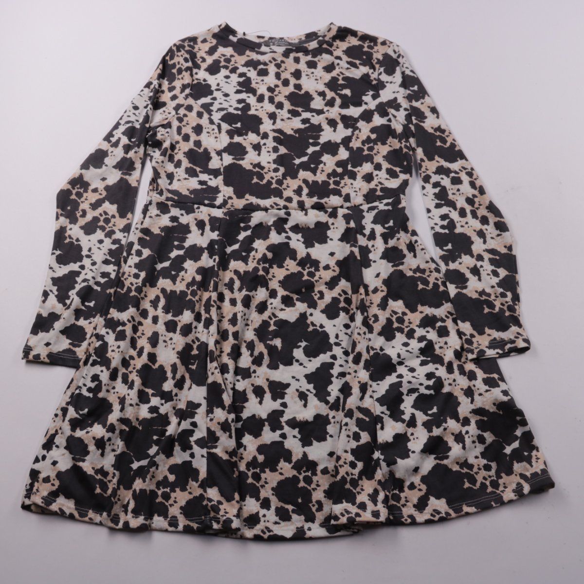 Повседневное платье Primark с длинным рукавом и пышной юбкой, принт под «корову» в чёрно-бежевой гамме. Подойдёт для прогулок и повседневных образов в межсезонье и прохладные дни. Трикотаж с эластаном немного тянется и не требует сложного ухода.